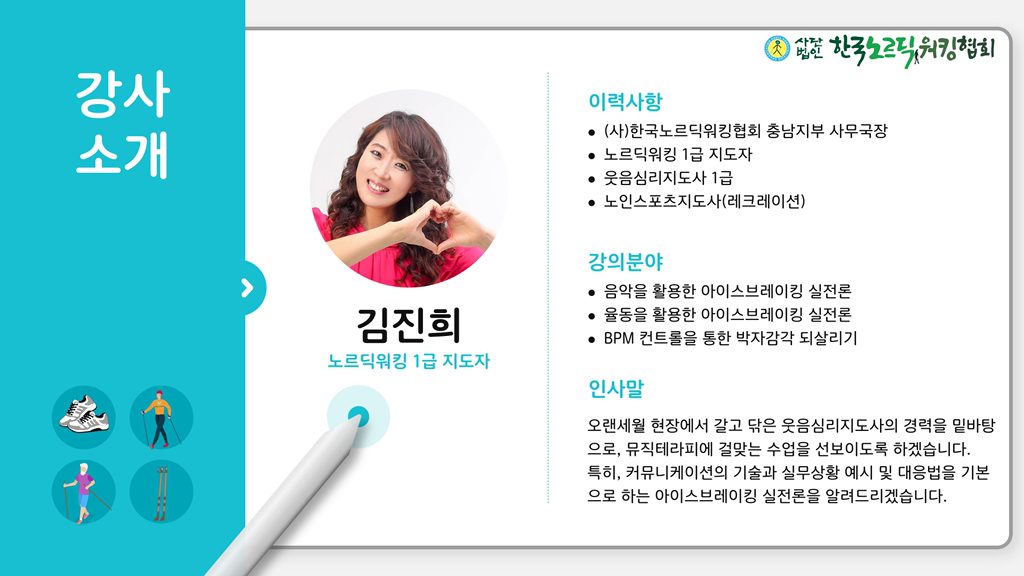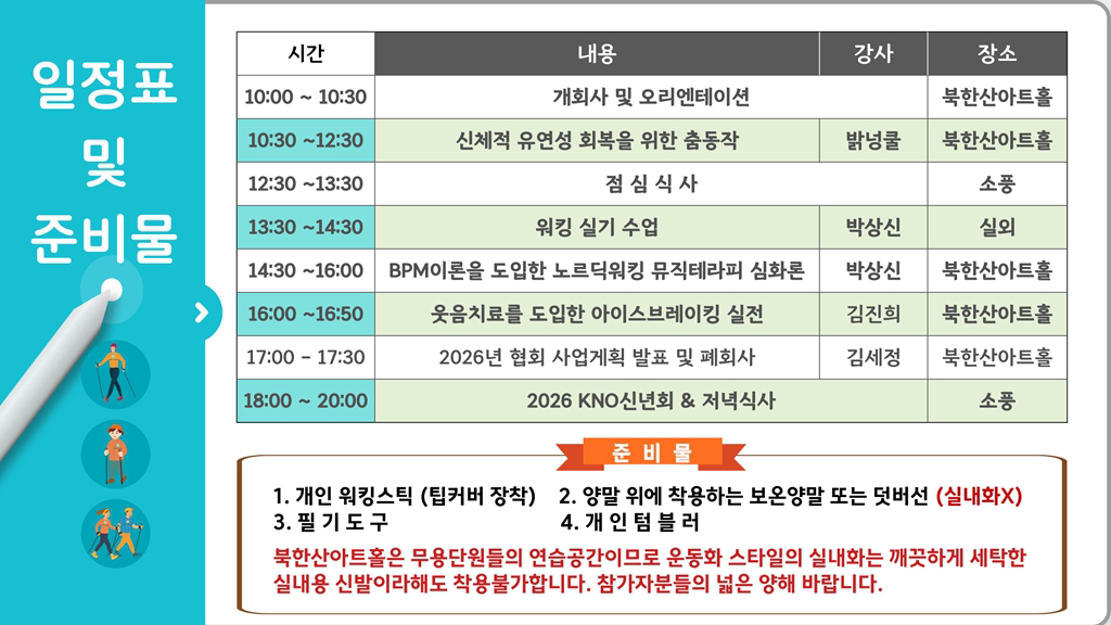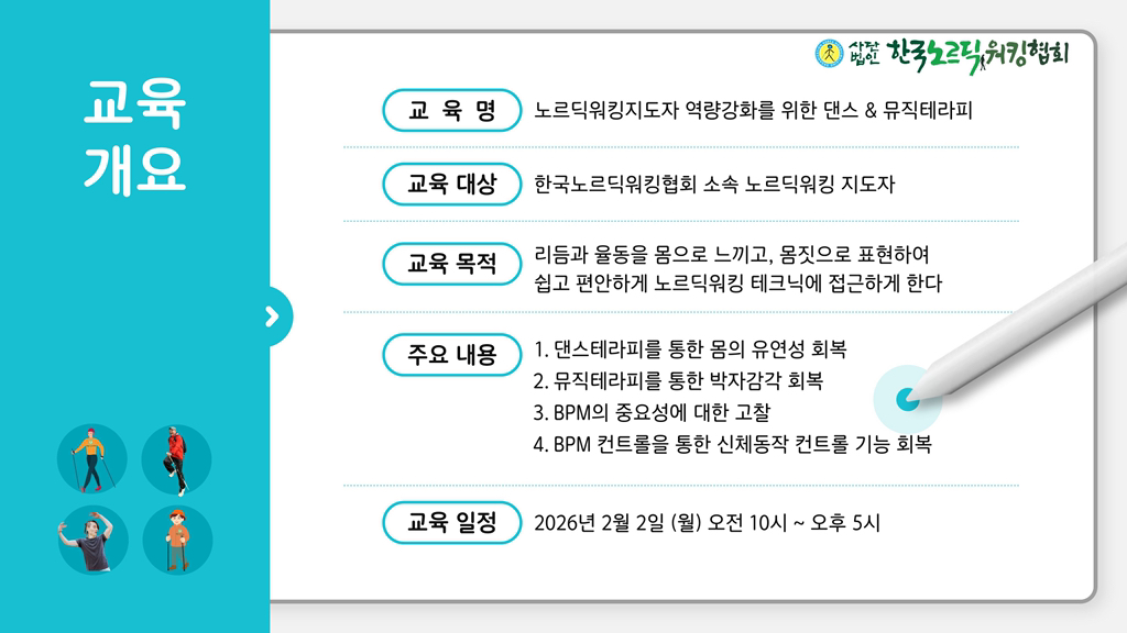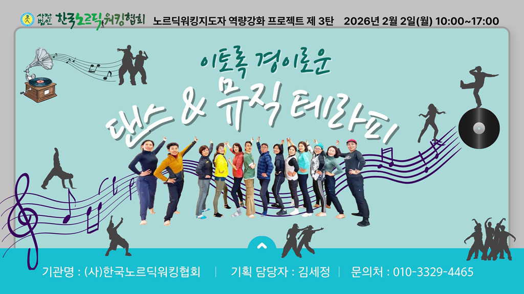 [노르딕워킹]한국노르딕워킹협회 지도자역량강화 워크숍 ‘이토록 경이로운 댄스 & 뮤직테라피’ 개최 작성자김세정[사무국장]|작성시간26.02.13|조회수23 목록 댓글 0 글자크기 작게가 글자크기 크게가 2026년 한국노르딕워킹협회 지도자역량강화 프로젝트 제 3탄!‘이토록 경이로운 댄스 & 뮤직테라피’ 개최. 다음검색 현재 게시글 추가 기능 열기 북마크 공유하기 신고 센터로 신고 댓글 댓글 0 댓글쓰기 답글쓰기 댓글 리스트
