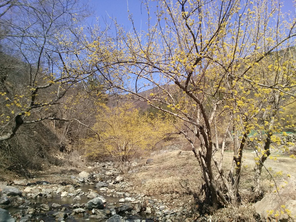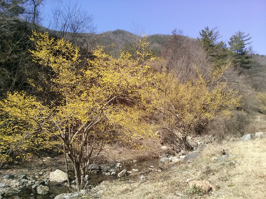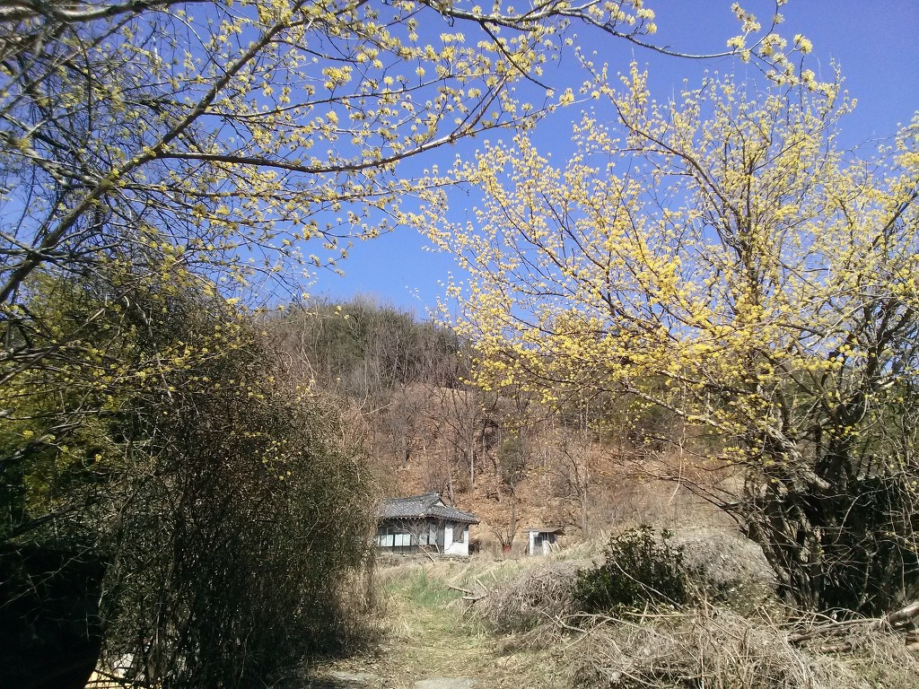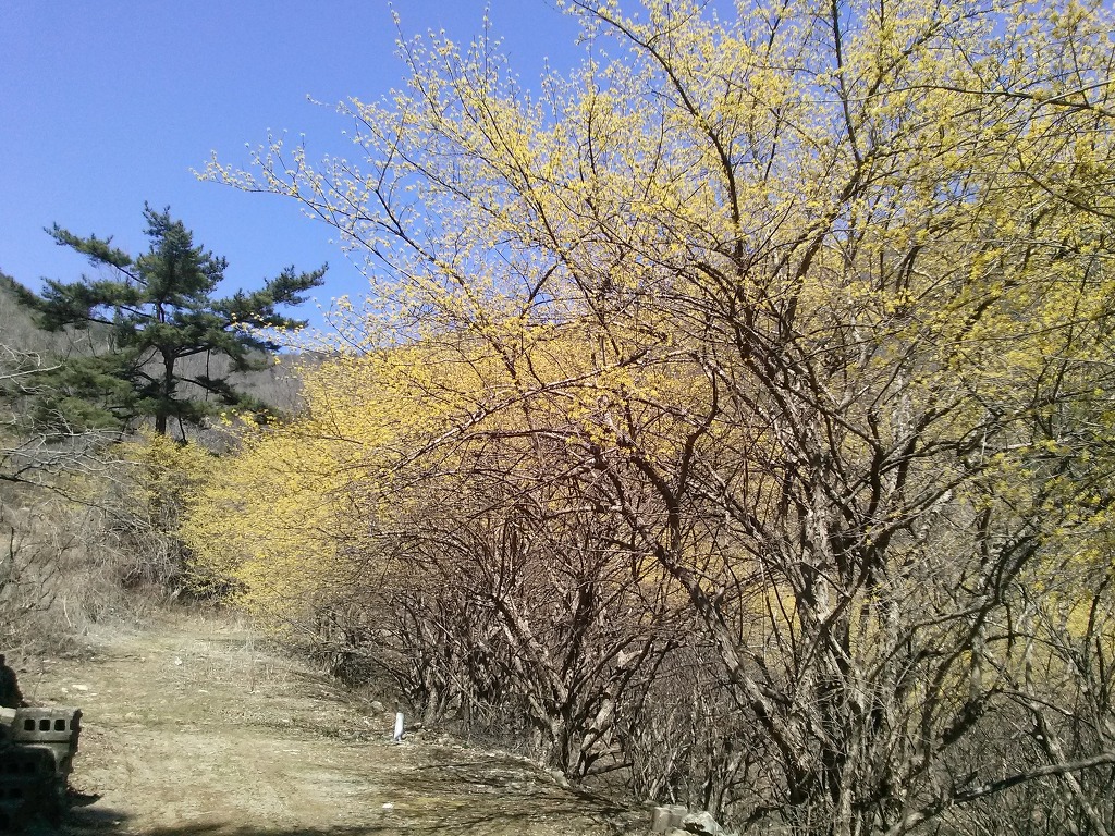 ....계곡으로 접근하여 가는 길로가면 보다 많은 산수유를 만나면서 백석암길과 합류함