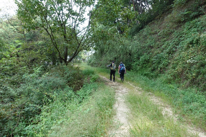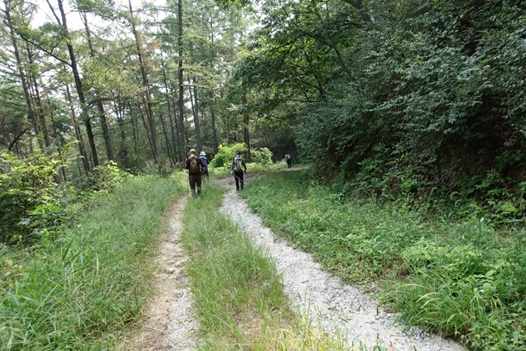 회원들이 임도 길을 산행하고 있다.