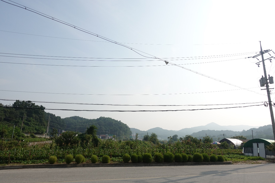 도로를 걸으니 멀리 자연의 상징 [象徵]인 산이 보인다.