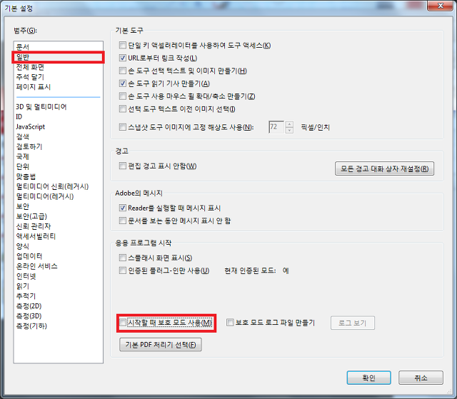 [Adobe Reader 10.x 버전의 경우] '기본 설정' 의 좌측 범주에서 '일반' 선택 후 하단의 '시작할 때 보호 모드 사용' 체크를 해제합니다.