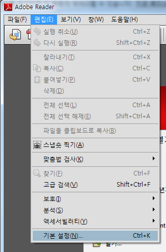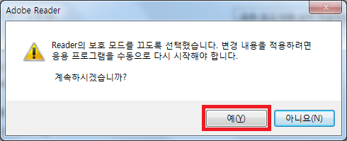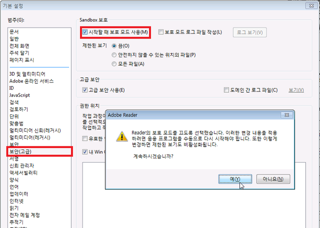 [Adobe Reader 11.x 버전의 경우] '기본 설정' 의 좌측 범주에서 '보안(고급)' 선택 후 상단의 '시작할 때 보호 모드 사용' 체크를 해제합니다. 확인창이 뜨면 '예' 클릭 합니다.
