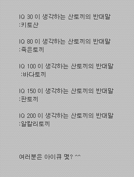 [스크랩] [유머]산토끼 반대말은 ?? 작성자클릭봉|작성시간11.03.31|조회수450 목록 댓글 2 글자크기 작게가 글자크기 크게가 다음검색 스크랩 원문 : B.L.S.O - 부산,경남 럭셔리세단 오너들의 모임 현재 게시글 추가 기능 열기 북마크 공유하기 신고 센터로 신고 댓글 댓글 2 댓글쓰기 답글쓰기 댓글 리스트 작성자cara(김현아) | 작성시간 11.04.11 전 80이군요 답댓글 작성자클릭봉 작성자 본인 여부 작성자 | 작성시간 11.04.16 ^^ 댓글 전체보기