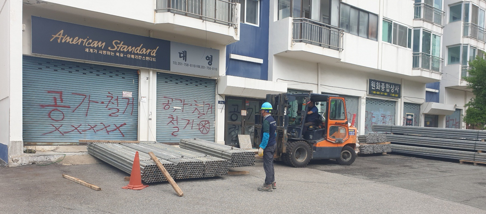 비산먼지특정공사 승인 및 부분철거 등의 협의가 완료되고 오늘부터 우리 촉진3구역은 철거의 시작을 알리는 휀스 설치 공사가 시작되었습니다.