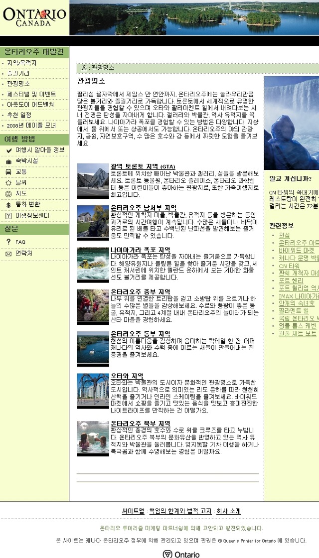 나이아가라 폭포가 있고 제1의 도시 토론토가 있는 온타리오주는 한글 홈페이지도 있다