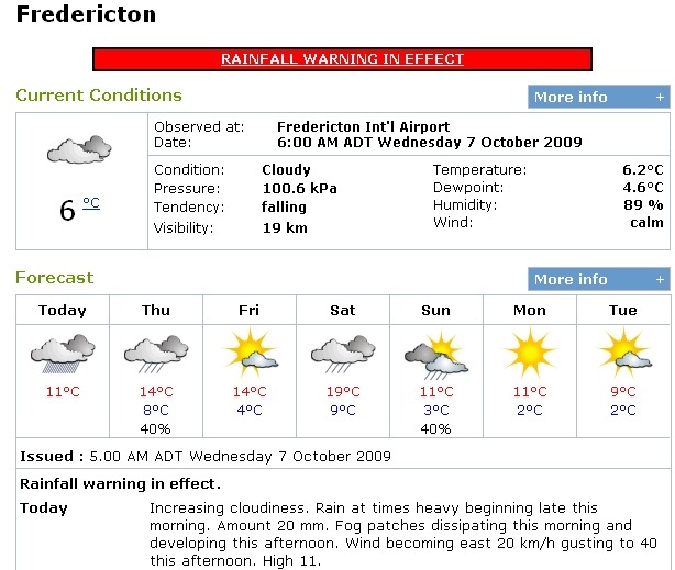 New Brunswick주의 금일('09.10.8) 주요 3도시 날씨는 한국보다 더 쌀쌀하다