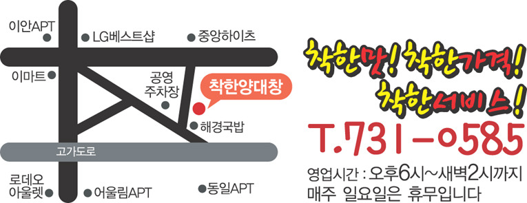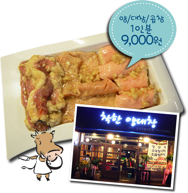 주인장 나이를 보면 아직 곱창에 손댈 군번이 아닌데 의아해서 물어보니 자갈치에서 곱창 터줏대감으로 자리 잡고 있는 이모의 도움을 많이 받았다고 한다. 곱창 1인분에 9천원이라는 놀라운 가격에 양념장과 곱창 손질은 누구보다도 자신있어하는 점이 당차다. 몸에 나쁜 연화제 대신 파인애플을 통째로 즙을 내 곱창의 성질을 잡는다며 본인이 소비자의 입장에 서서 가격이며 맛을 위해 노력하는 말그대로 착한 집이다. 곱창을 너무 좋아하는데 높은 가격으로 인한 불만을 직접 가게를 차려 아주 간단하게 해소해 버린 셈이다.