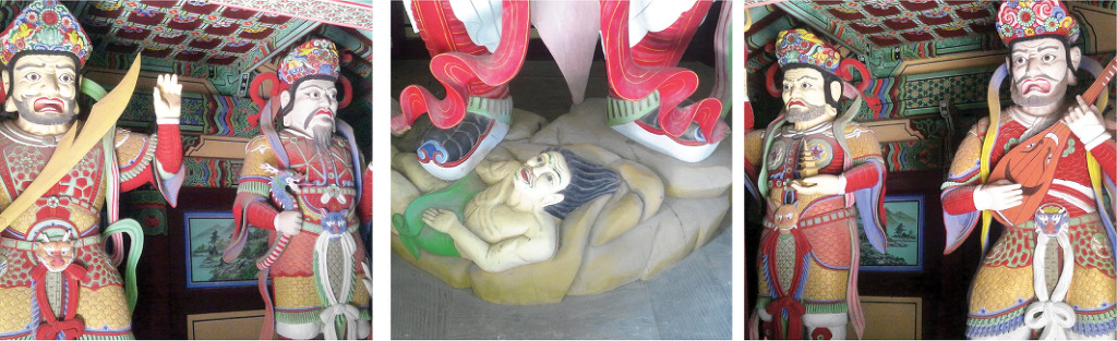 불교에서 사천왕이란 천상계의 첫 번째 하늘인 욕계 6천 가운데 제 1천에 해당하는 사천왕천을 다스리는 왕들을 말한다. 불교의 세계관에 의하면 하늘의 중앙에는 수미산이 있고, 그 산의 중턱에는 동서남북의 각각에 천왕이 있는데, 동쪽에는 지국천왕, 남쪽에는 증장천왕, 서쪽에는 광목천왕, 북쪽에는 다문천왕이 그 지역을 관장하고 있다. 사천왕이란 원래 고대 인도의 신화적 존재였으나 불교에 흡수되면서 온갖 귀신을 다스리며 불법을 수호하는 호법신이 되었다. 천왕들의 얼굴 표정은 분노하는 무서운 모습을 하고 있는데, 이런 모습들은 착한 마음을 보호하고, 악한 마음을 가진 무리들을 힘으로 굴복시켜 교화하는 임무를 띠고 있다. 이같은 임무를 상징하기 위해 사천왕의 발밑에는 귀신의 모습을 한 생령좌가 괴로운 표정을 짓고 있다. 가상생물인 생령좌는 사람의 마음 속에 있는 악을 형상화한 것이다.