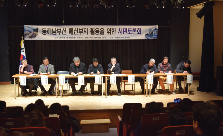 지난 1월 12일 해운대문화회관에서 동해남부선 폐선부지 활용을 위한 시민토론회가 열렸다. 해운대기찻길 친구들의 주최로 열린 토론회에선 주민대표들과 시민단체들이 참석하여 활용방안을 강구했다.