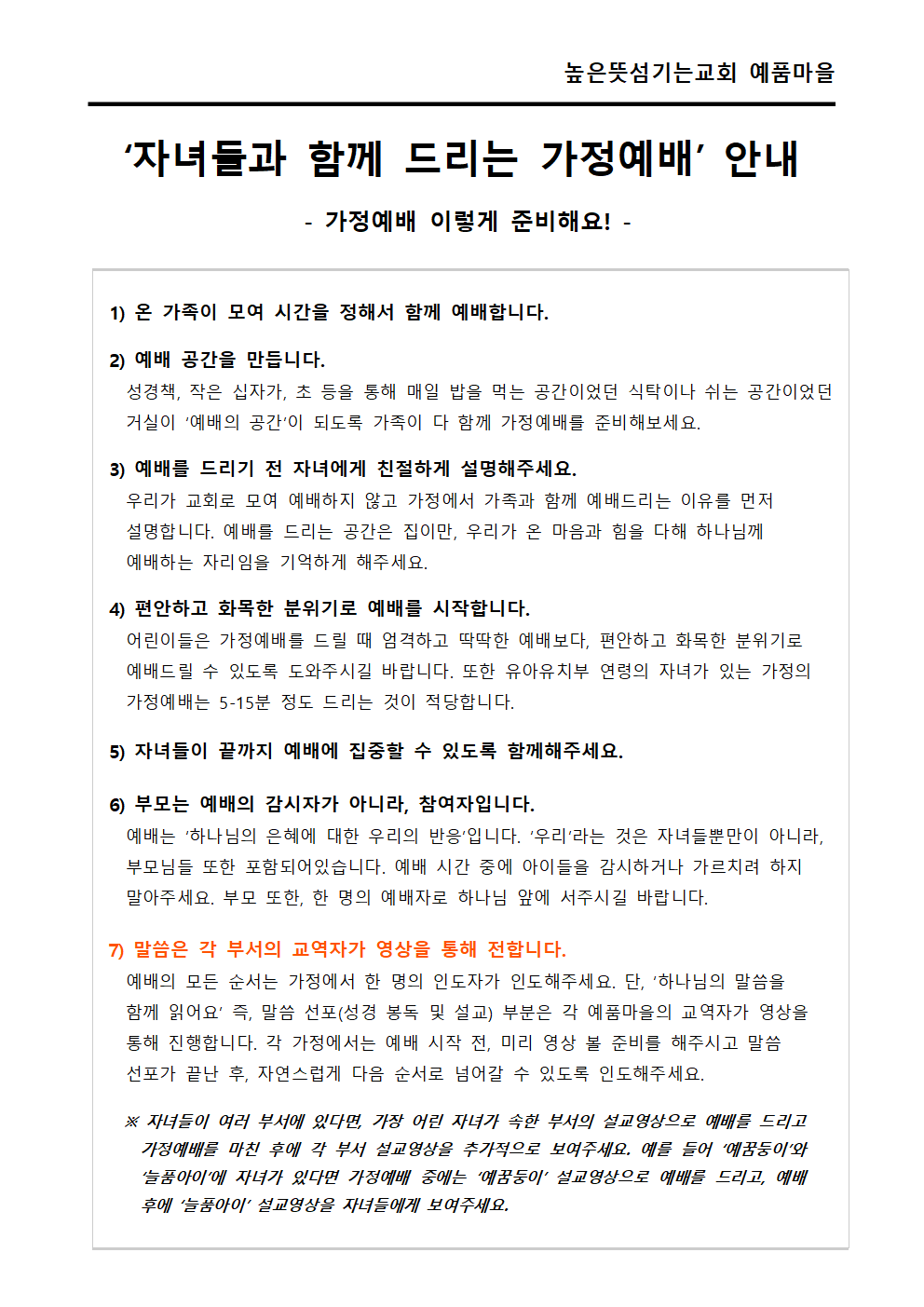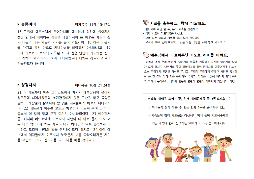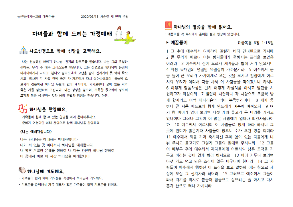 자녀들과 함께 드리는 가정예배지_3월 15일(주일) 작성자곽하은|작성시간20.03.14|조회수146 목록 댓글 0 글자크기 작게가 글자크기 크게가 3월 15일 (주일) 자녀들과 함께 드리는 가정예배지를 올립니다. 각 부서 교역자의 설교영상은 부서를 통해 공유합니다.하나님의 은혜와 사랑이 가득한 예배되시길 기도하겠습니다. 예품마을 가정예배 지침.png 자녀들과 함께 드리는 가정예배(0315).pdf 자녀들과 함께 드리는 가정예배(0315)001.png 자녀들과 함께 드리는 가정예배(0315)002.png 첨부파일첨부된 파일이 6개 있습니다. png 파일 자녀들과 함께 드리는 가정예배(0315)001.png 다운로드 png 파일 자녀들과 함께 드리는 가정예배(0315)002.png 다운로드 png 파일 예품마을 가정예배 지침.png 다운로드 pdf 파일 자녀들과 함께 드리는 가정예배(0315).pdf 다운로드 png 파일 자녀들과 함께 드리는 가정예배(0315)001.png 다운로드 png 파일 자녀들과 함께 드리는 가정예배(0315)002.png 다운로드 다음검색 현재 게시글 추가 기능 열기 북마크 공유하기 신고 센터로 신고 댓글 댓글 0 댓글쓰기 답글쓰기 댓글 리스트