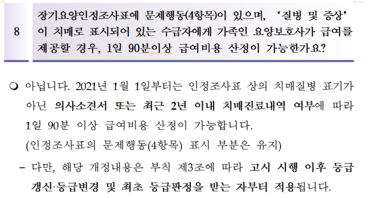 ※ 65세 이상인 요양보호사가 그 배우자에게 방문요양급여를 제공하거나 수급자가 치매로 폭력성향 등 문제행동