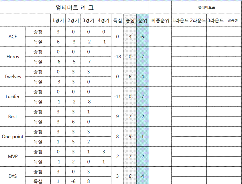 플레이오프는 야구의 플레이오프를 조금 더 범위를 확장시켜서 적용한 것으로 학생들이 리그에 포기하지 않고 끝까지 열심히 참여하게 하게 하였단 측면에서 매우 좋은 효과를 보았다고 생각합니다.