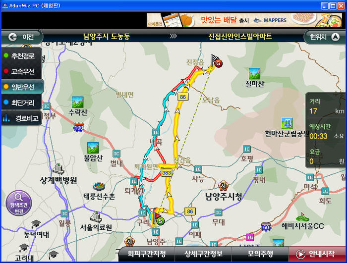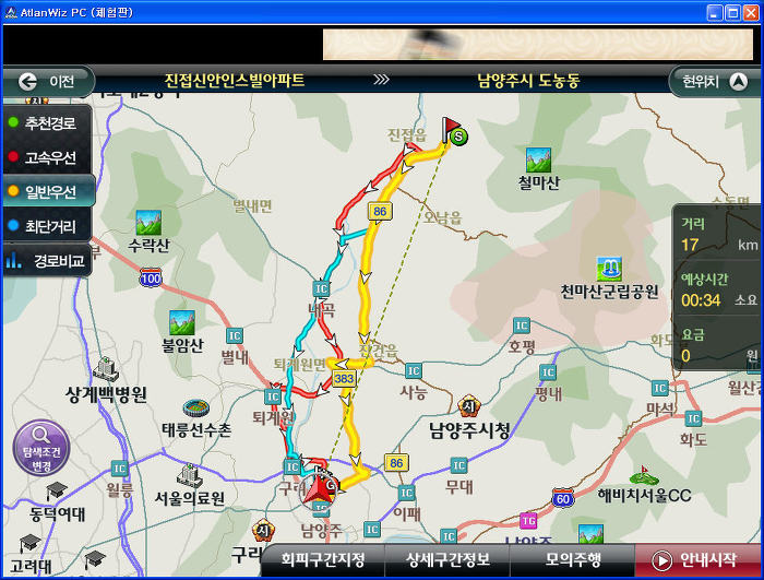 참고로, 스마트폰의 U+navi 맵피에서도 아틀란의 일반 우선 경로와 같은 코스를 도출하지 못합니다. 86번-383번 지방도 코스를 안내하는 내비가 흔치 않다는 겁니다. 교통정보 반영한 경우를 제외하고는 말이죠. 교통정보를 반영한다고 해서 항시 이 경로가 나온다고 장담할 수도 없는 것이기도 하고요.