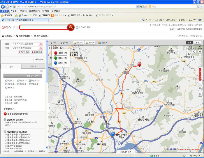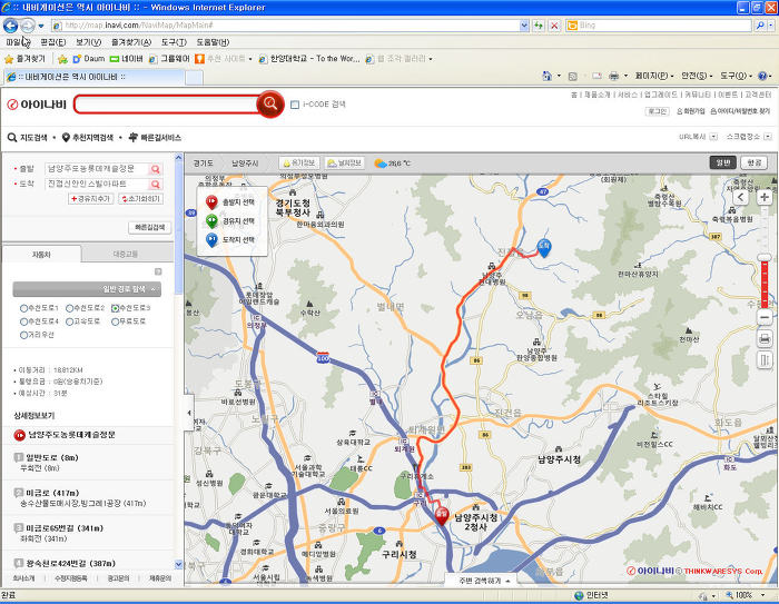 도농동에서 진접 지구를 오고 갈 때는 길을 잘 아는 사람은 86번 지방도와 383번 지방도를 이용합니다. 이 길이 차선도 넓고 통행량도 비교적 적기 때문이죠. 이 코스를 뽑아낸다면 길 안내 잘 하는 내비라고 할 수 있습니다.