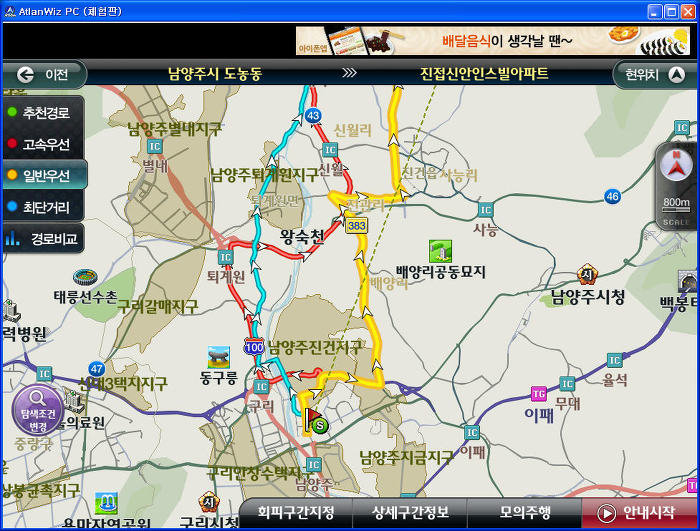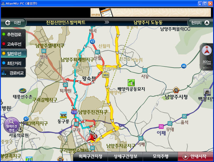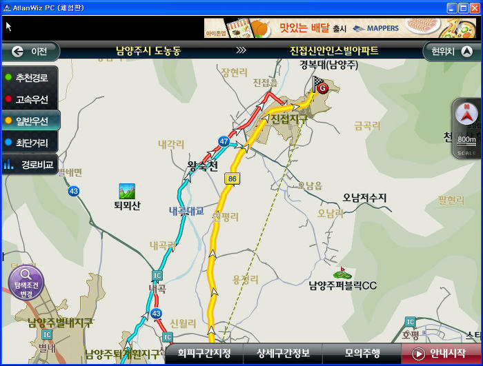 47번 국도는 상습 정체 구간이며 주말이면 포천 등으로 놀러가고 오고 하는 차량 때문에 몸살나는 구간입니다. 대다수의 내비들이 47번 도로 위주의 경로를 많이 안내합니다. 따라서 86번-383번 지방도를 안내할 수 있다는 것은 아틀란의 대단한 경쟁력입니다.