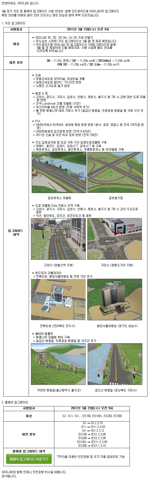정기 지도와 펌웨어 업그레이드 시행 및 안드로이드용 아이나비3D 업그레이드 예정 안내 공지 작성자김춘동(돌고래)|작성시간11.03.23|조회수1,480 목록 댓글 11 글자크기 작게가 글자크기 크게가 출처: (주) 팅크웨어(아이나비) 홈페이지 다음검색 현재 게시글 추가 기능 열기 북마크 공유하기 신고 센터로 신고 댓글 댓글 11 댓글쓰기 답글쓰기 댓글 리스트 답댓글 작성자황규섭(야화) | 작성시간 11.03.24 네 티펙 사용을 안하시면 펌웨어 업글은 안하셔도 됩니다. 작성자박종현(둥굴이) | 작성시간 11.03.24 정보 감사합니다^^ 작성자김장현 | 작성시간 11.03.24 정보 감사합니다 작성자천리향 (김완영) | 작성시간 11.03.24 정보 감사합니다.^^ 작성자최기영 | 작성시간 11.03.24 덕분에 업데이트 신속, 무사히 마쳤습니다.빠른 정보 감사합니다. 댓글 전체보기