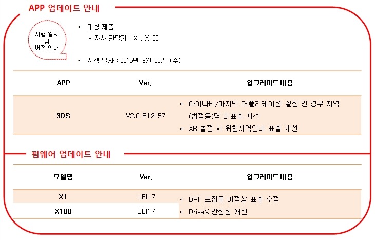 내비게이션 X1, X100 펌웨어 및 APP 업데이트 안내 작성자이현동|작성시간15.09.24|조회수234 목록 댓글 3 글자크기 작게가 글자크기 크게가 http://www.inavi.com/CustCenter/Notice/Dtls/2379 다음검색 현재 게시글 추가 기능 열기 북마크 공유하기 신고 센터로 신고 댓글 댓글 3 댓글쓰기 답글쓰기 댓글 리스트 작성자SKY_손경 | 작성시간 15.09.24 정보 감사합니다. 작성자박종현 | 작성시간 15.09.24 항상 좋은정보 올려주셔서 감사합니다.^^ 작성자진기성(우리가족) | 작성시간 15.09.25 정보 감사합니다. 댓글 전체보기