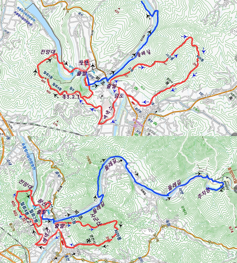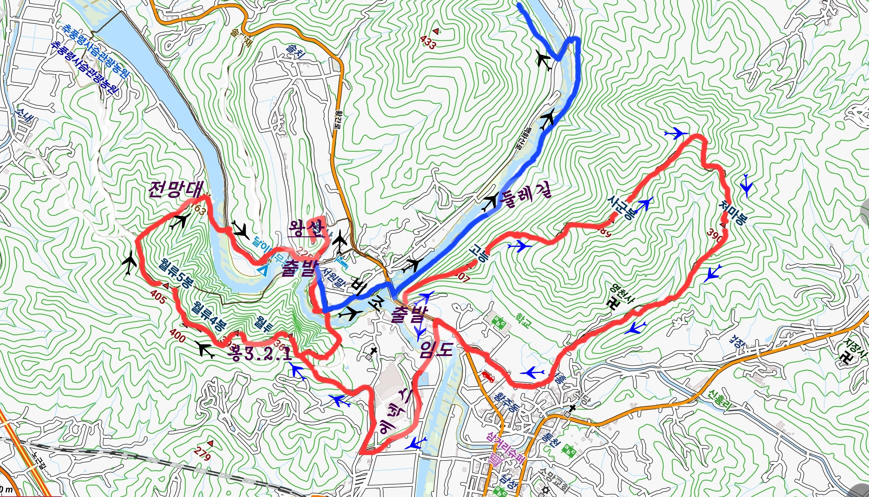 옵션1.원촌교-고등-사군봉-치마봉-임도-에넥스-월류봉1.2.3.4.5봉-주차장-왕상완복11km