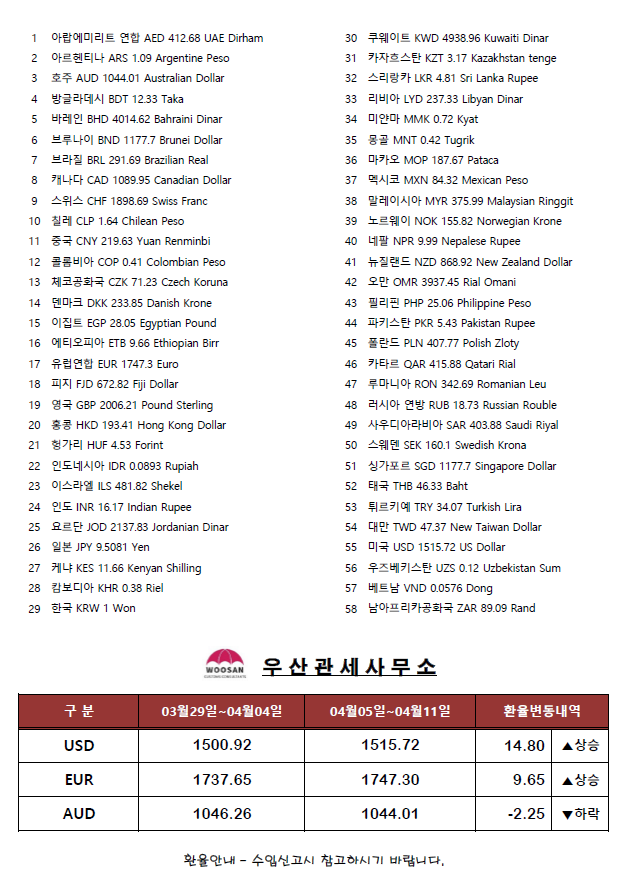 4/5 ~ 4/11환율정보입니다. 작성자우산관세사|작성시간26.04.03|조회수31 목록 댓글 0 글자크기 작게가 글자크기 크게가 2026.04.05 ~ 2026.04.11 적용환율 우산관세사 송병기(010-3318-3935) 다음검색 현재 게시글 추가 기능 열기 북마크 공유하기 신고 센터로 신고 댓글 댓글 0 댓글쓰기 답글쓰기 댓글 리스트