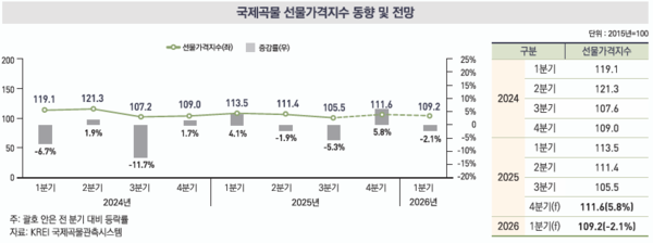 다만 2026년 1분기 선물가격지수는 109.2로 올 4분기 대비 2.1% 소폭 하락할 것으로 예측됐다.