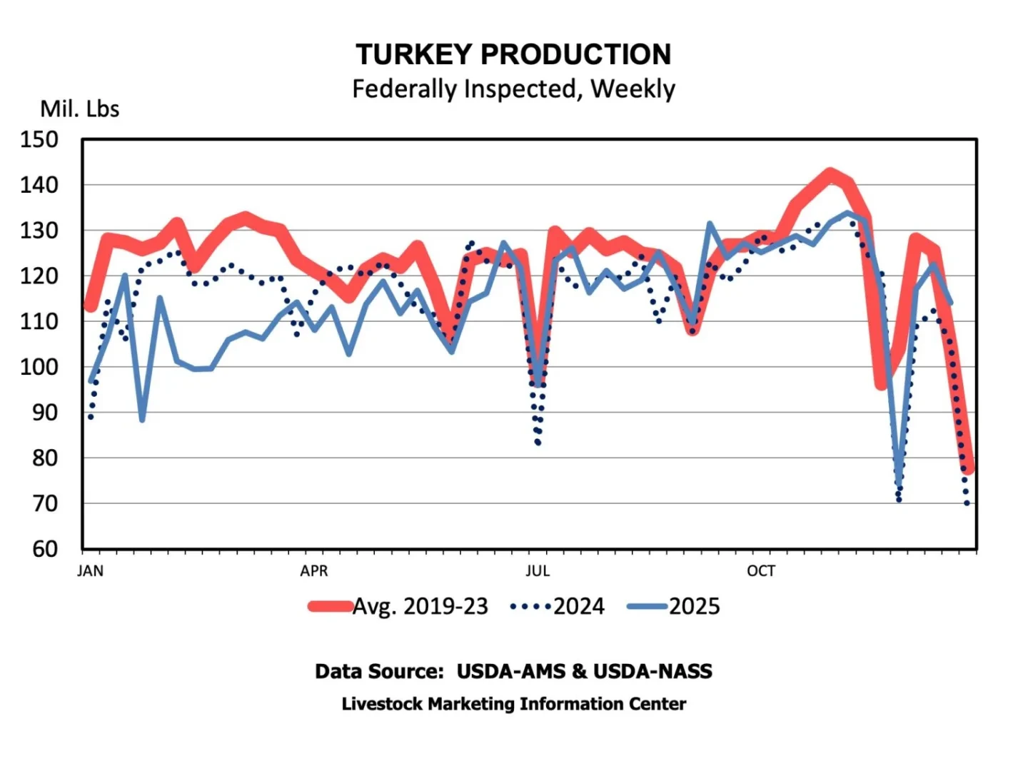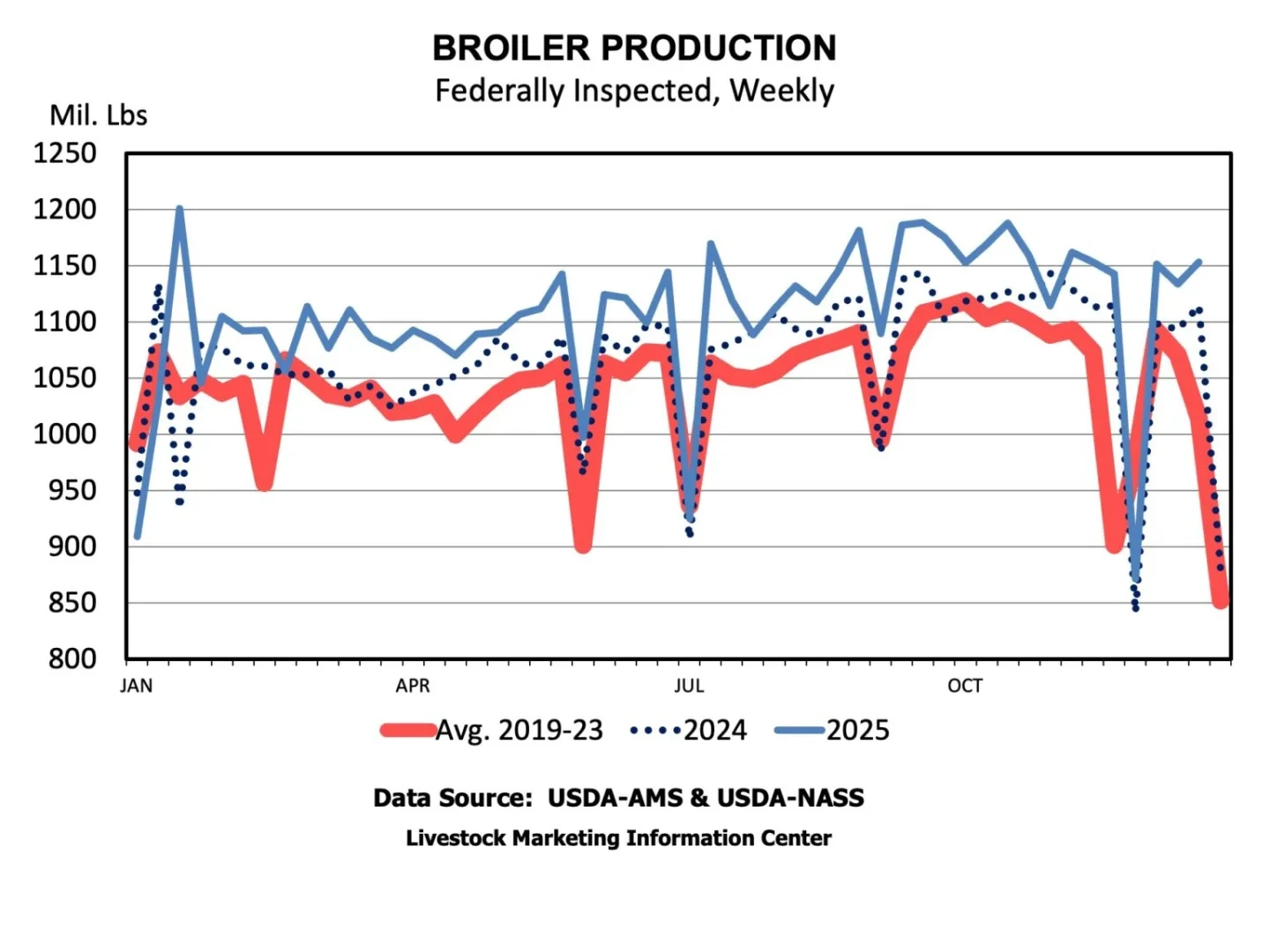 그 해 동안 2024년보다 3.5%(19억 파운드) 더 많은 육계 고기가 생산되었습니다. 튀르키예 생산량은 약 1억 2,200만 파운드 감소했습니다. 균형 있게 보면, 가금류 생산량 증가가 붉은 고기 생산량 감소를 상쇄하여 총 육류 생산량이 약 8억 파운드 증가했습니다.