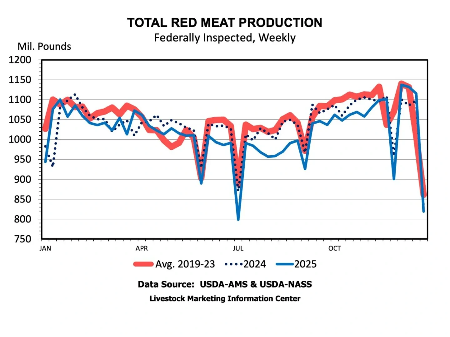 올해 붉은 육류 생산량은 2024년보다 1.9% 감소한 약 10억 파운드에 달했습니다. 소고기 생산량은 약 3.3% 감소했고, 돼지고기 생산량은 거의 0.5% 감소했습니다. 2025년에는 양고기가 약 1% 더 생산되었습니다.