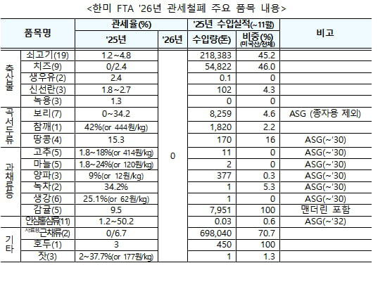 2026년 한미FTA 관세철폐 품목. 농림축산식품부 제공