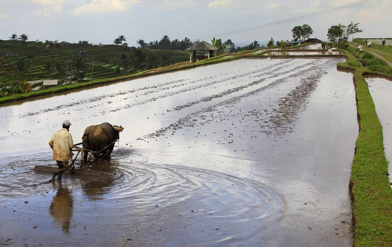 사진: 발리의 계단식 논에서 일하는 농부와 물소
