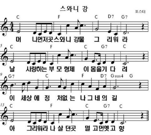 아래 첨부된 다장조 곡 ‘스와니 강’을 연습해 보세요. 아주 천천히 연주해도 돼요.