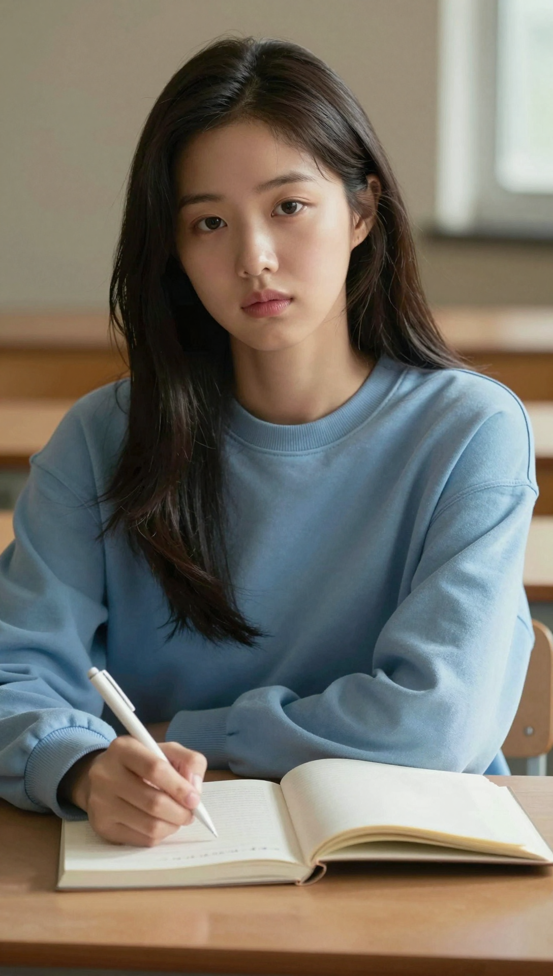 A beautiful Korean young woman sitting at a wooden desk in a quiet study room, writing in an open notebook with a white pen, upper-body close framing from slightly above eye level, body facing forward with one arm resting on the desk, long dark brown hair naturally falling over one shoulder, wearing a soft sky-blue sweatshirt, minimal accessories, clean casual fashion, eyes looking directly toward the camera with calm yet emotionally restrained loneliness, subtle introspective gaze, brows softly relaxed, lips gently closed with faint tension, expression conveying silent solitude and emotional depth, warm neutral indoor lighting, soft beige background, shallow depth of field, natural skin tone, cinematic soft contrast, gentle color grading, emotional realism, ultra-detailed, professional photography, 4k masterpiece quality