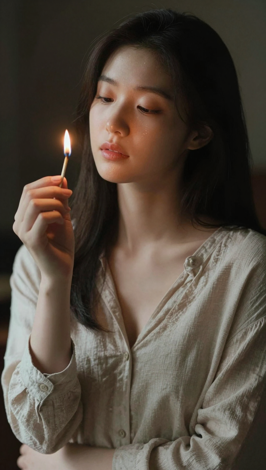 Beautiful cute Korean young woman holding a softly burning match close to her face in a dark quiet room, gentle introspective expression with closed eyes and relaxed lips, smooth natural skin softly illuminated by warm orange flame light, long dark brown hair falling naturally over her shoulders, wearing a loose light beige linen blouse with subtle fabric texture, cinematic low-key lighting with deep shadows surrounding her silhouette, flame casting delicate highlights across her cheekbones, nose bridge, and eyelids, soft glow reflecting in faint moisture on her skin, minimalist black background with faint soft gradients, shallow depth of field with ultra-sharp facial focus, warm amber and deep brown color grading, realistic skin and fabric rendering, fine film grain texture, professional cinematic portrait photography style, emotional poetic atmosphere, calm spiritual mood, elegant minimal composition, ultra-high resolution, 4k masterpiece, premium visual quality
