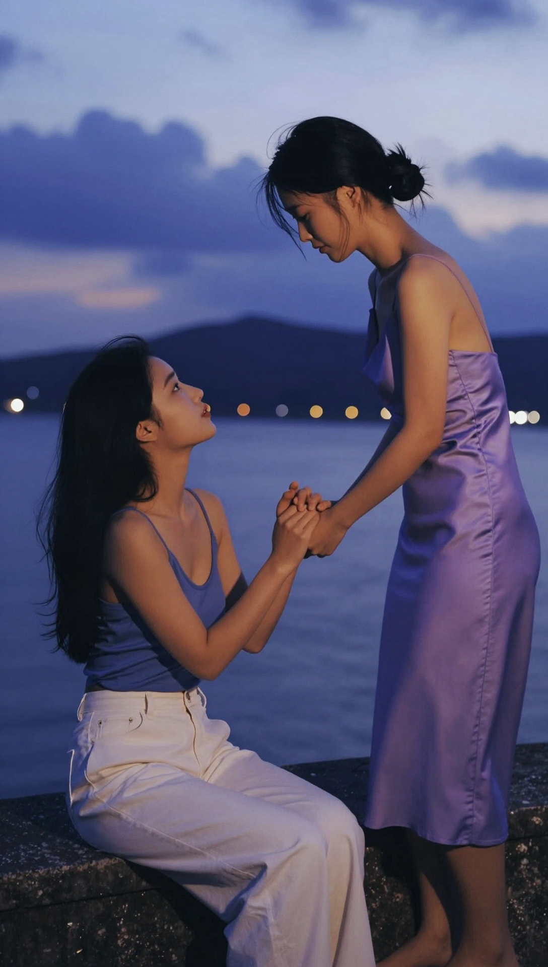 This medium-full shot, captured during the blue hour, depicts two human figures positioned on a stone parapet overlooking a body of water. The figure on the left is seated in profile, with their torso oriented toward the right. They possess long, dark hair and are dressed in a slate-blue cropped camisole and high-waisted, off-white trousers. Their facial expression features an upward curvature of the labial commissures. The second figure stands to the right, leaning their anterior trunk forward at a significant diagonal angle toward the seated figure. This individual wears a floor-length, sleeveless lavender satin dress and has their hair secured in a posterior bun. The two figures engage in a tactile gesture, with their phalanges intertwined as they hold hands in the center of the frame. The seated figure's right arm is flexed at the elbow, while the standing figure's arm is extended downward. The background consists of a dark expanse of water and a silhouetted mountain range beneath a sky filled with scattered, dark cumulus clouds. Distant terrestrial lights create a series of orange and yellow bokeh orbs along the horizon. The dominant color theme is a cool-toned indigo and lavender, with the lighting temperature residing in the low-Kelvin range of deep twilight. The chromatic atmosphere is characterized by a serene cyanosis and low-contrast luminosity. Soft, natural light provides a subtle rim effect on the figures' profiles, while the overall exposure maintains deep shadows, treating the subjects as dark forms against the fading sky.,