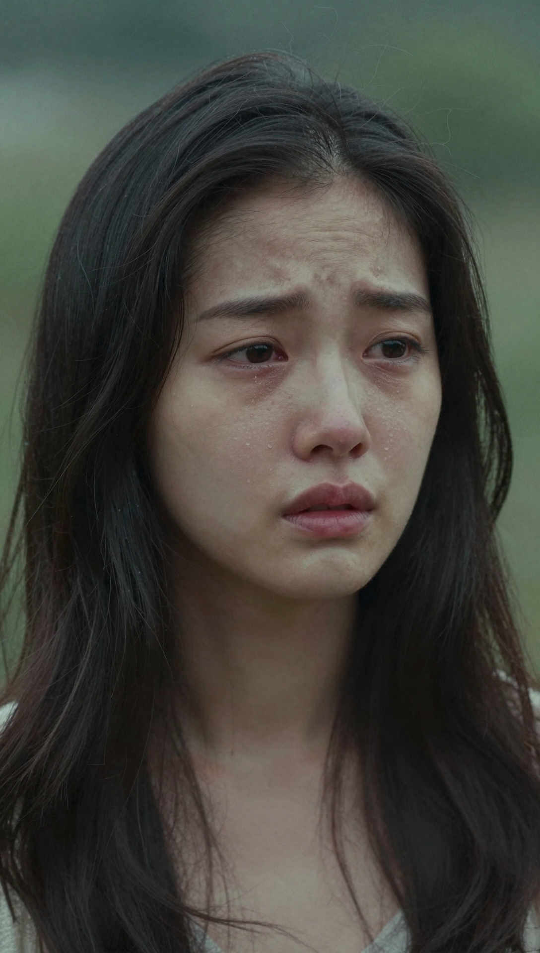 Beautiful cute Korean young woman with an unbearably heartbreaking expression, eyes trembling with tears welling deeply but never falling, gaze completely unfocused as if trapped in irreversible loss, lower eyelids shaking with restrained collapse, upper eyelids heavy with exhaustion and sorrow, brows softly but painfully drawn together, lips slightly parted with silent trembling breath, corners of the mouth barely holding composure, face filled with longing, abandonment, regret, and quiet despair, emotional pain held inside without release, fragile dignity in suffering, cinematic emotional depth, ultra-detailed facial emotion realism
