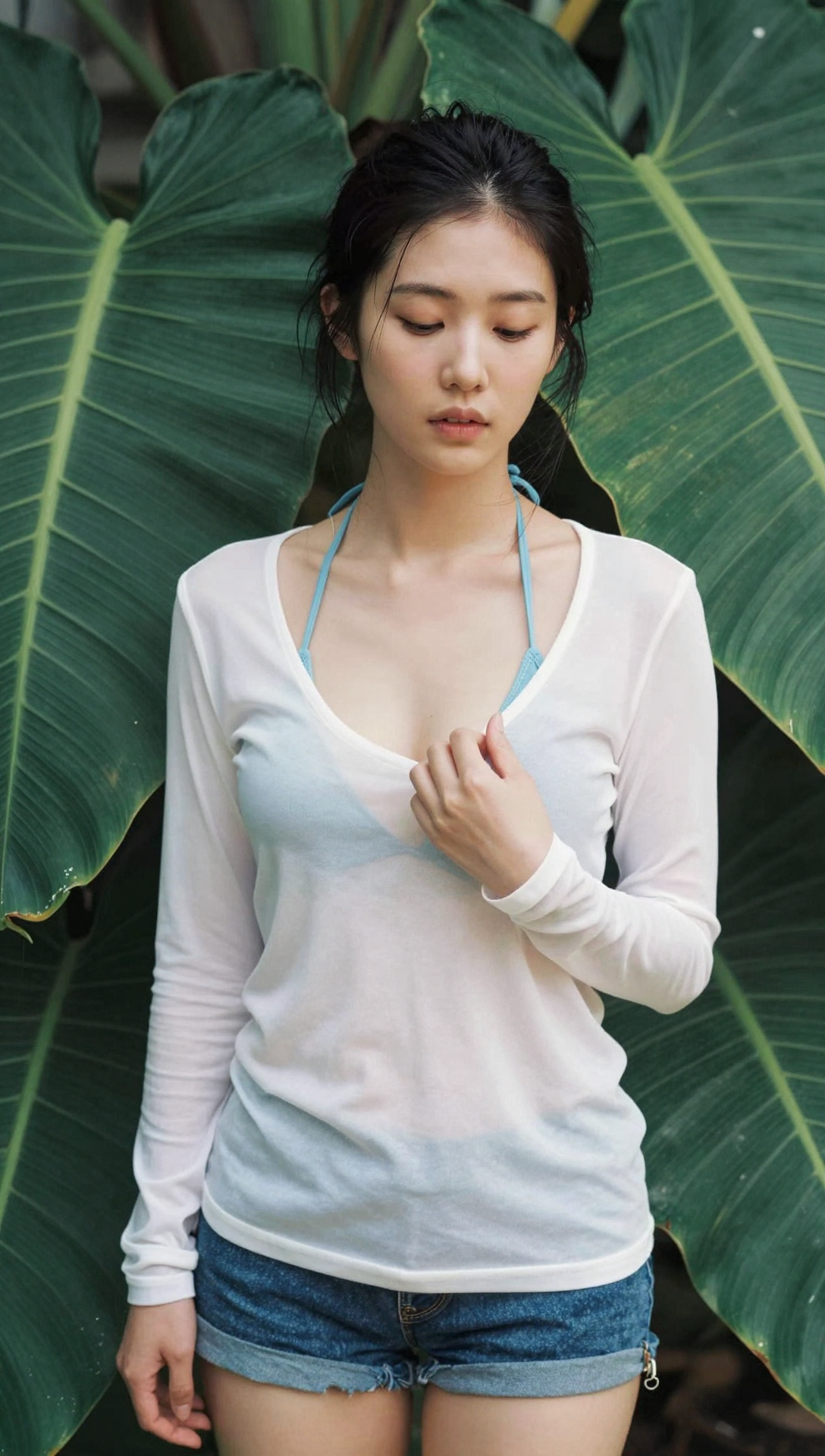 An Asian woman standing among large green tropical leaves, captured from a medium close-up angle at eye-level. She has a fair skin tone, dark hair styled in a loose updo, and is wearing a sheer white long-sleeve top that reveals a light blue bikini top underneath. She also wears denim shorts. Her right hand is gently holding the strap of her bikini top, and she has a calm, slightly introspective expression with her eyes closed and lips slightly parted. The lighting is natural, with soft, diffused sunlight filtering through the leaves, creating a gentle, serene atmosphere. The depth of field is moderate, with the background leaves slightly blurred to keep the focus on the woman. The texture of the leaves is prominent, with visible veins adding depth to the scene. The photograph uses a shallow depth of field, keeping the subject in sharp focus while the background is softly blurred. The overall composition is balanced, with the green leaves framing the woman on both sides. The vantage height is at eye-level, providing an intimate and direct view of the subject.