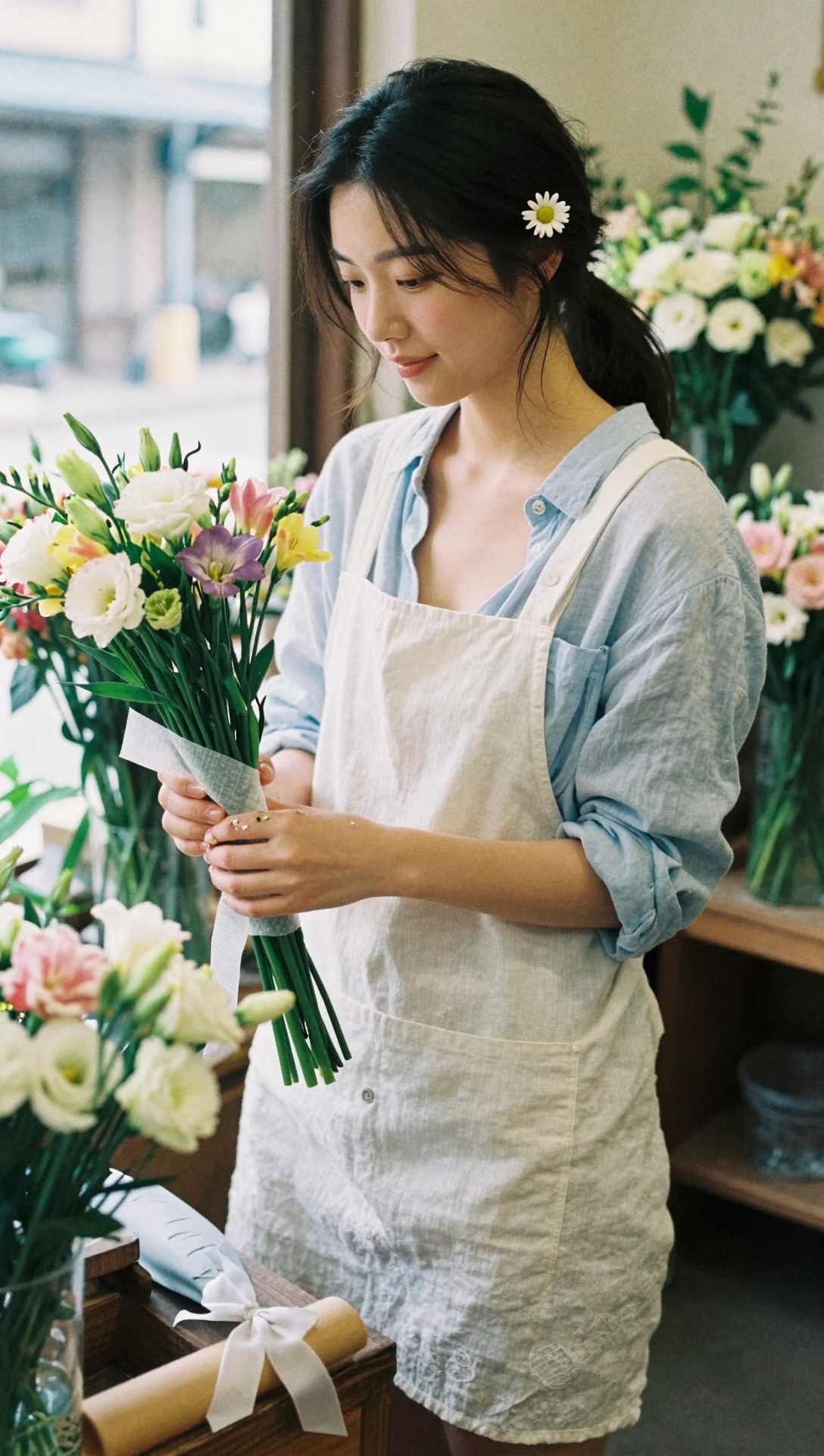 a young Korean woman with gentle eyes and a faint smile. Her gaze is focused and meticulous as she holds a bouquet of flowers. Her black hair is half-up, with the rest falling naturally over her shoulders, adorned with a small daisy. She wears a light white linen apron over a light blue cotton-linen shirt, the sleeves rolled up to her elbows. Her fingers are stained with a few petal fragments. Standing beside a wooden flower stand, she supports the base of the bouquet in one hand and gently wraps the flower stems with washi paper in the other, her fingers deftly folding and shaping the paper. She is slightly turned away from the flower stand, which is decorated with various lisianthus, freesias, wrapping paper, and ribbons. Behind her, a flower stand is filled with fresh flowers, and outside the glass window is a Japanese street scene. The texture is fresh and gentle, full of the sweet fragrance of a flower shop.