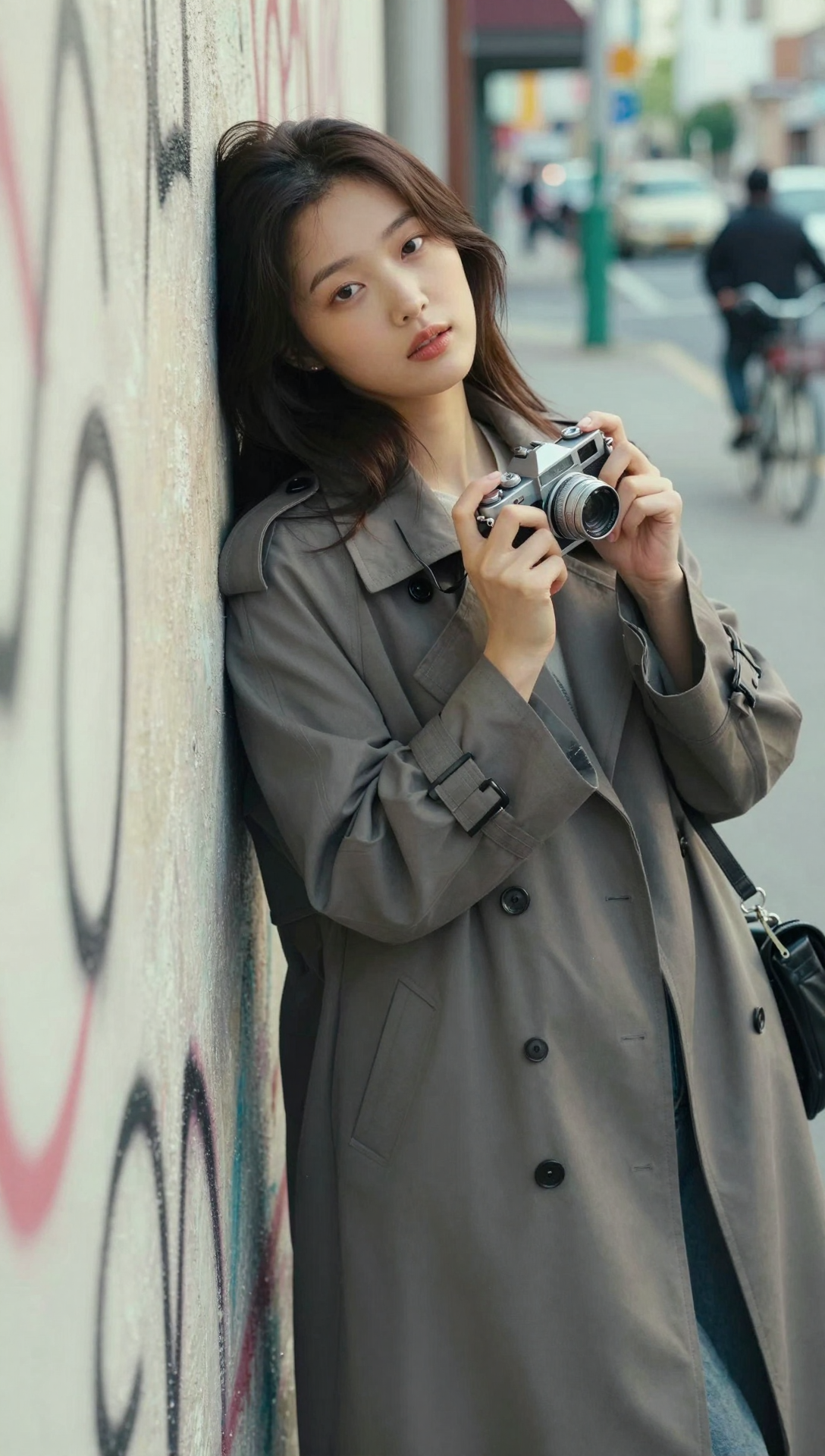 A stylish beautiful Korean young woman leaning casually against a graffiti-covered urban wall, head slightly tilted, soft thoughtful gaze directed at the camera, lips gently parted, long natural dark brown hair tucked behind one ear, holding a small vintage silver film camera with both hands near her chest, wearing an oversized gray trench-style coat over a simple inner top, relaxed elegant posture, soft natural daylight, shallow depth of field, blurred city street with bicycles and pedestrians in the background, muted pastel urban color palette, calm artistic mood, smooth natural skin texture, minimal makeup, lifestyle street photography style, cinematic clarity, ultra high resolution 4k masterpiece quality