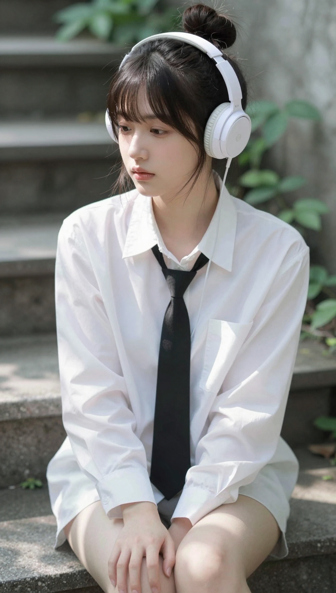 Beautiful cute Korean young woman sitting quietly on outdoor stone steps surrounded by lush green leaves, soft dappled sunlight filtering through foliage creating natural shadow patterns across her face and shirt, calm introspective expression with gentle focused eyes, smooth natural skin, slim delicate figure with relaxed posture, dark brown hair tied in a loose high bun with straight soft bangs framing her forehead, wearing a crisp white button-up shirt with a slim black tie, subtle fabric translucency in strong sunlight, white over-ear headphones resting comfortably on her head with thin cable visible, serene contemplative atmosphere, shallow depth of field with softly blurred greenery and stone background, cinematic natural lighting, soft film grain texture, pastel-toned color grading, high facial clarity, realistic fabric and skin texture, professional lifestyle portrait photography style, modern youthful mood, quiet emotional elegance, harmonious composition, ultra-high resolution, 4k masterpiece, premium visual quality