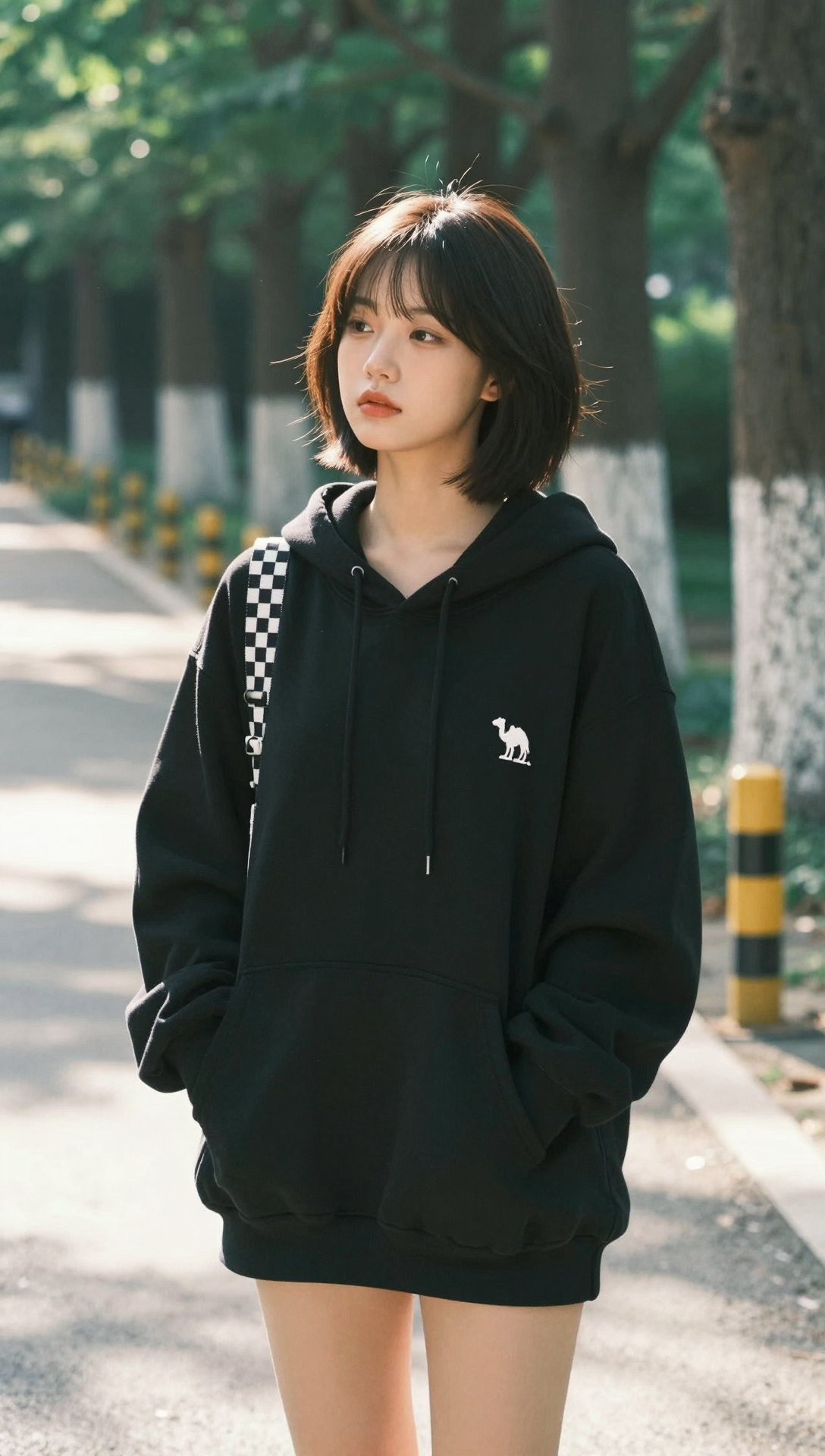 Beautiful cute Korean young woman standing quietly on a sunlit forest pathway, soft morning light filtering through tall trees creating gentle lens flare and dappled shadows, short dark brown bob haircut with natural bangs framing her face, calm but slightly distant expression with thoughtful eyes looking to the side, lips softly closed with subtle tension, smooth pale skin with delicate natural blush, wearing an oversized black hoodie with a small white camel logo on the chest, black-and-white checkered shoulder strap crossing diagonally, hands hidden inside hoodie pockets, relaxed yet lonely posture, tree trunks with white painted bases behind her, yellow roadside bollards along the path, soft green foliage surrounding, cinematic shallow depth of field, warm nostalgic color grading, realistic skin and fabric texture, gentle emotional solitude atmosphere, modern lifestyle photography style, balanced composition, ultra-high resolution, 4k masterpiece, premium visual quality