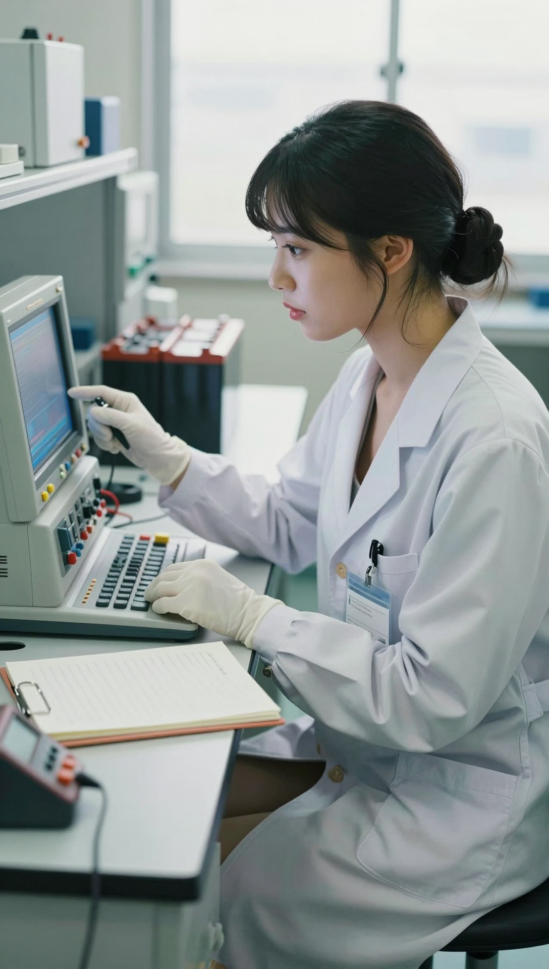a 26-year-old Japanese female new energy engineer. Her expression is calm and serene as she glances at the screen of a battery testing instrument, recording data with one hand and operating the equipment with the other, her demeanor meticulous and focused. Her long black hair is styled in a low bun, secured with a simple hairpin, with no stray hairs. She wears a light gray lab coat over a light-colored shirt, clean gloves, and a name tag around her neck. Seated upright at the new energy testing workbench, she holds a pen in one hand, recording data in her lab notebook, while the other lightly presses the buttons on the battery testing instrument. Her gaze shifts between the screen and the notebook. On the workbench are battery testing cabinets, a lab notebook, a multimeter, and new energy battery cells. The background is a metal frame holding the experimental equipment, bathed in even, cool white light, the pale blue glow of the instrument screen illuminating her face. Using a 28mm f/2.8 lens with an aperture of f/3.5, and a Fuji Classic Chrome filter, the details are so realistic that you can see the texture of the lab coat, the handwriting in the lab notebook, and the buttons on the instruments. The clean and professional feel perfectly matches the working environment of a new energy laboratory.