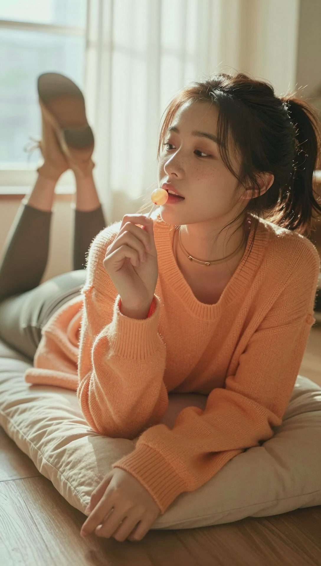 A realistic pastel toned photo of a young 19yo woman lying comfortably on her stomach near a window, legs bent upward in a relaxed playful pose. She styled in a loose ponytail, soft freckles across her cheeks and nose, and a gentle playful expression as she winks while holding a lollypop between her lips. She wears a cozy oversized sweater in muted orange tones, paired with dark leggings and lace up boots. A delicate choker rests around her neck, catching subtle highlights from the light. The lighting is soft and cinematic, warm sunlight streaming through a window behind her, diffused by thin curtains, creating glowing rim light along her hair and shoulders. Pastel shadows blend into warm yellows, peach and soft green reflections, giving the scene a dreamy yet grounded atmosphere. The color palette is balanced and gentle, pastel orange, warm cream, soft olive and muted amber, avoiding harsh contrast. Skin is rendered naturally, semi realistic with painterly softness rather than sharp detail. The overall mood is intimate, cozy and slightly flirtatious, blending illustration and realism in a calm, luminous scene.