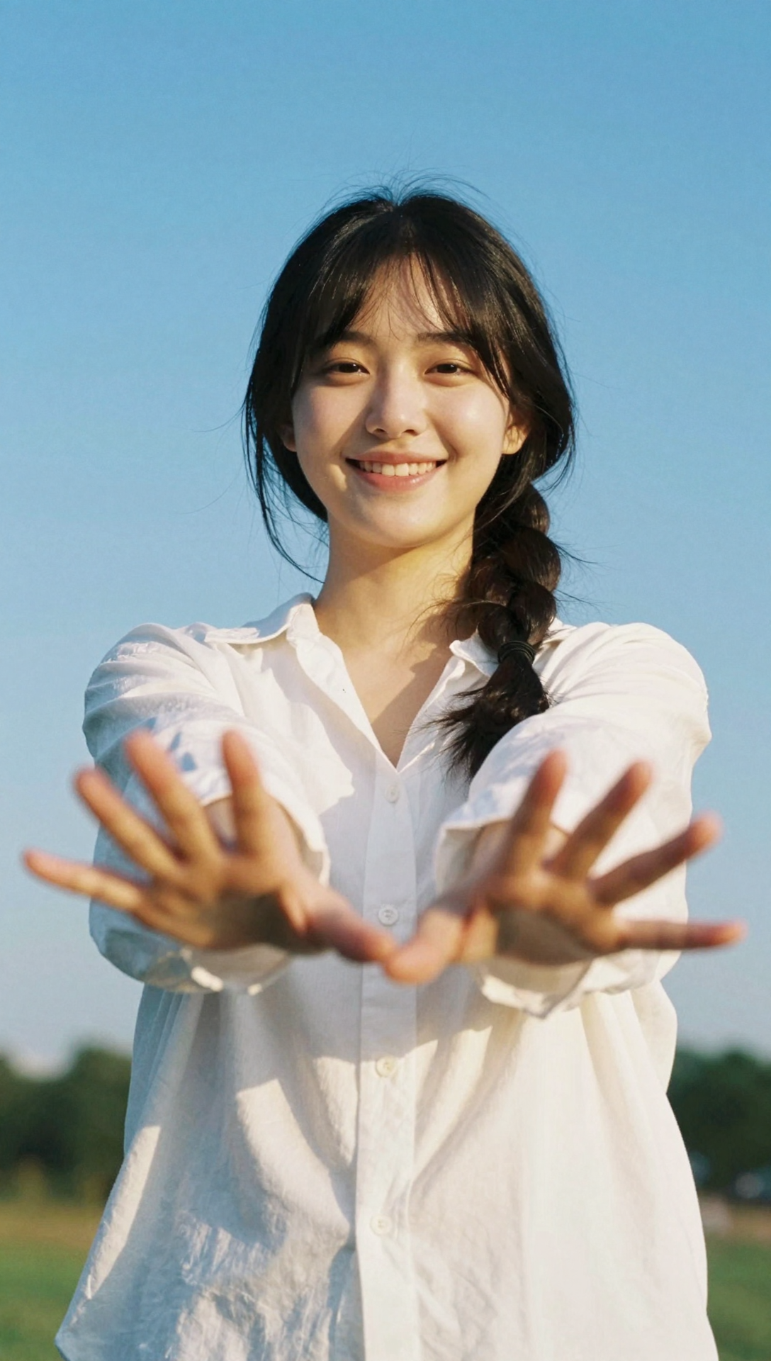 A vertical medium shot features a young East Asian woman centered against a vast, clear sky. The subject is positioned in the middle ground, facing the camera with her upper extremities extended forward toward the lens. Her hands are open with phalanges splayed, appearing in a soft bokeh blur that creates a sense of depth. The womanâs cranium is slightly tilted, framed by dark hair styled with wispy bangs and a single braid draped over her right clavicle. Her facial expression is a wide smile, which elevates the zygomatic regions and narrows the palpebral fissures of her eyes. She wears a crisp, white, long-sleeved button-down textile shirt with a structured collar. The spatial relationship places the subject between the blurred foreground of her hands and a distant, out-of-focus horizon featuring dark green arboreal shapes. The lighting is characterized by a warm, golden temperature, likely from a low-angle sun, which casts a bright highlights on her forehead, nose, and the folds of her white garment. The dominant color theme is a contrast between the brilliant cerulean of the sky and the stark white of the clothing. This creates a chromatic atmosphere of radiant solar clarity and vibrant luminosity., <lora:l226_Chiaroscuro Slider:0.5>