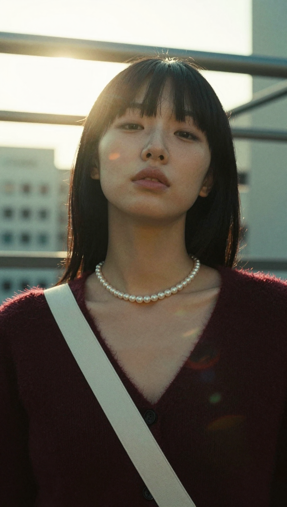 A low-angle, medium-shot photograph of a person positioned centrally, viewed from the chest up against a high-contrast urban background. The subject has straight, dark hair with blunt-cut bangs that veil the forehead, while the rest of the hair falls behind the shoulders. The facial expression is neutral with a calm, steady gaze directed slightly downward toward the camera lens. Around the neck sits a single-strand pearl necklace. The subject wears a dark maroon, fuzzy-textured knit garment, with a wide white fabric strap crossing diagonally from the viewerâs left shoulder toward the center. The composition is dominated by a strong backlight provided by horizontal, rectangular light fixtures situated directly behind the subjectâs head, creating a bright halo effect and soft, orange-toned light leaks on the periphery of the hair. The foreground and the subjectâs facial features are underexposed and cast in soft shadow, revealing subtle anatomical contours of the jawline and neck. In the lower-left background, the dark, repetitive grid of a distant building facade is faintly visible through the gloom. The dominant color theme is a combination of sickly-sweet ochre and deep, bruised burgundy. The lighting temperature is a discordant clash of searing, incandescent amber from the backlights and a cool, mossy emerald-green in the shadowed mid-tones. The chromatic atmosphere is one of heavy-grain nostalgia and low-fidelity grit, with significant visual noise throughout the frame that softens edges and provides a speckled, tactile texture to the image.