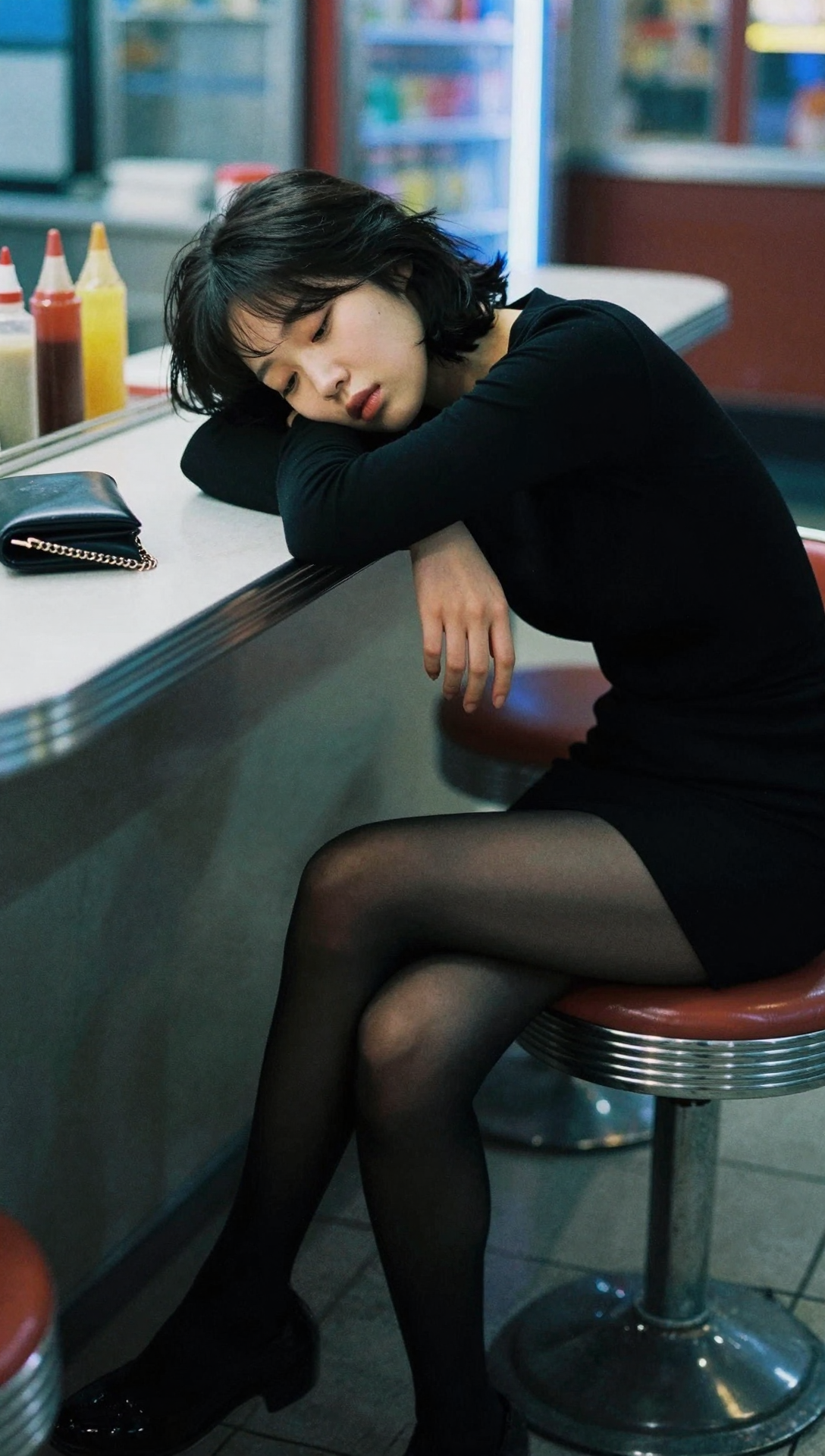 A stylish beautiful Korean young woman sitting on a small diner stool late at night, body leaning forward, head resting softly on her folded arms on a metal counter, eyes gently closed with a tired melancholic expression, short slightly tousled black hair framing her face, wearing a fitted long-sleeve black dress and sheer black tights, slender legs crossed loosely, one hand hanging relaxed beside her knee, a small black clutch bag with chain strap placed on the counter, colorful condiment bottles and glass display case behind her, cool blue neon diner lighting mixed with soft warm highlights, cinematic film atmosphere, shallow depth of field, subtle film grain texture, emotional lonely mood, smooth natural skin texture, minimal makeup, high contrast lighting, dramatic urban night photography style, ultra high resolution 4k masterpiece quality