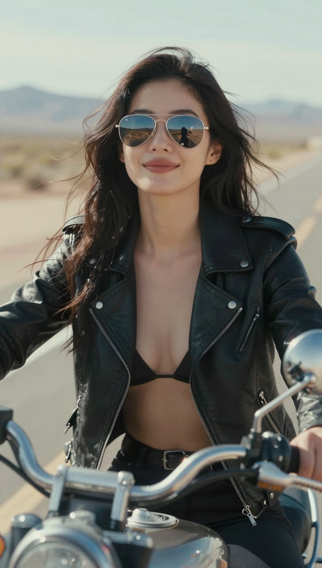 woman with long wind-blown hair taking a bold selfie from motorcycle handlebars, wearing black leather jacket, aviator sunglasses reflecting desert highway, Arizona arid landscape in background under bright daylight, one hand on throttle, confident smirk, photorealistic, ultra high detail, cinematic front-facing perspective