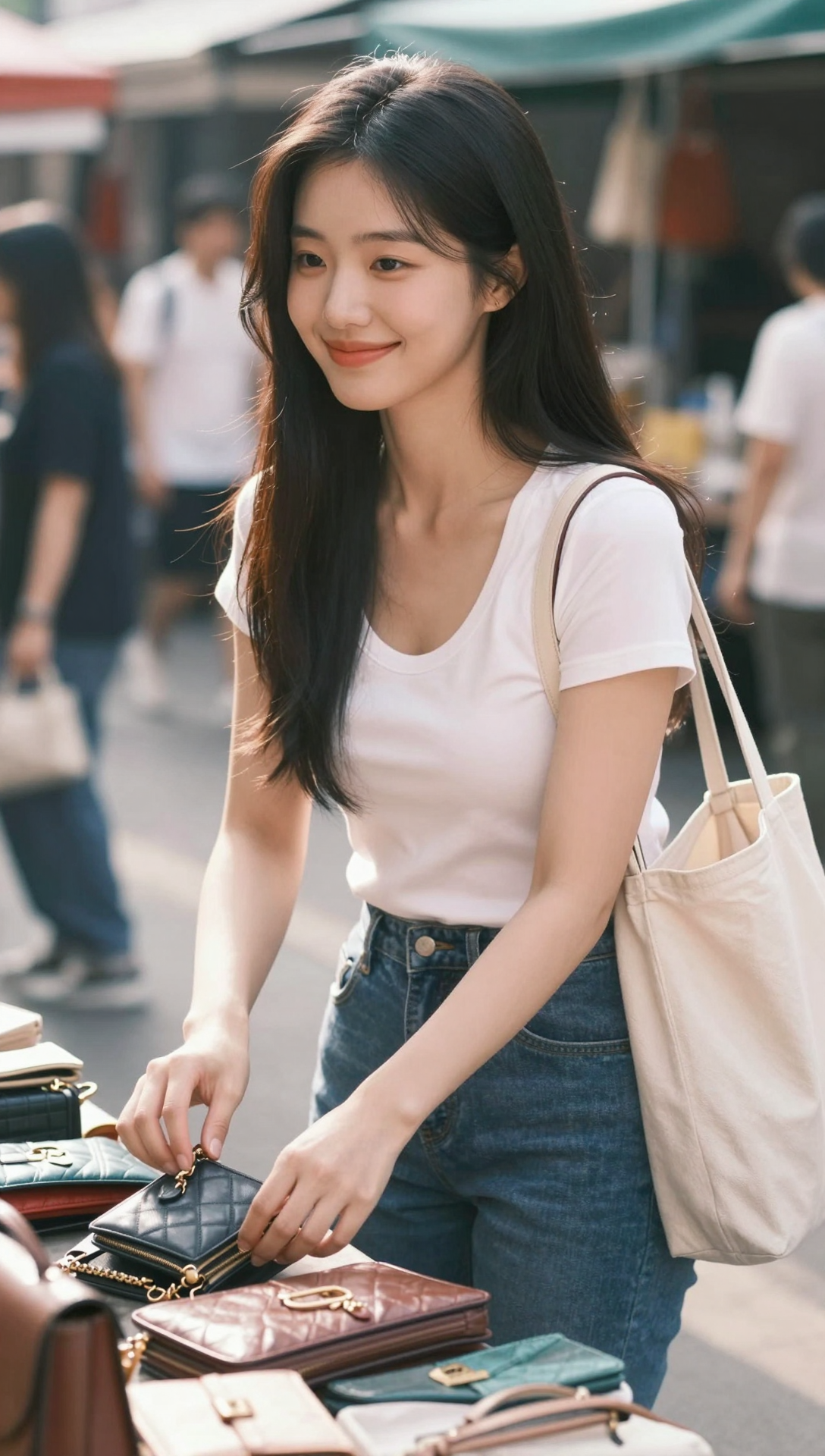 Beautiful cute Korean young woman smiling softly while browsing small bags at an outdoor street market table, gentle warm sunlight illuminating her smooth natural skin, long straight black hair flowing lightly over her shoulders, bright clear eyes filled with curiosity and warmth, subtle joyful expression with relaxed lips and soft cheeks, wearing a clean white short-sleeve t-shirt and fitted blue jeans, cream canvas tote bag hanging naturally from her shoulder, slightly leaning forward with both hands delicately touching a small wallet on the table, colorful handbags neatly arranged in front of her, softly blurred crowd and stalls in the background, cinematic shallow depth of field, natural lifestyle photography composition, warm soft color grading, realistic fabric and skin texture, peaceful everyday happiness atmosphere, professional street photography style, harmonious lighting balance, ultra-high resolution, 4k masterpiece, premium visual quality