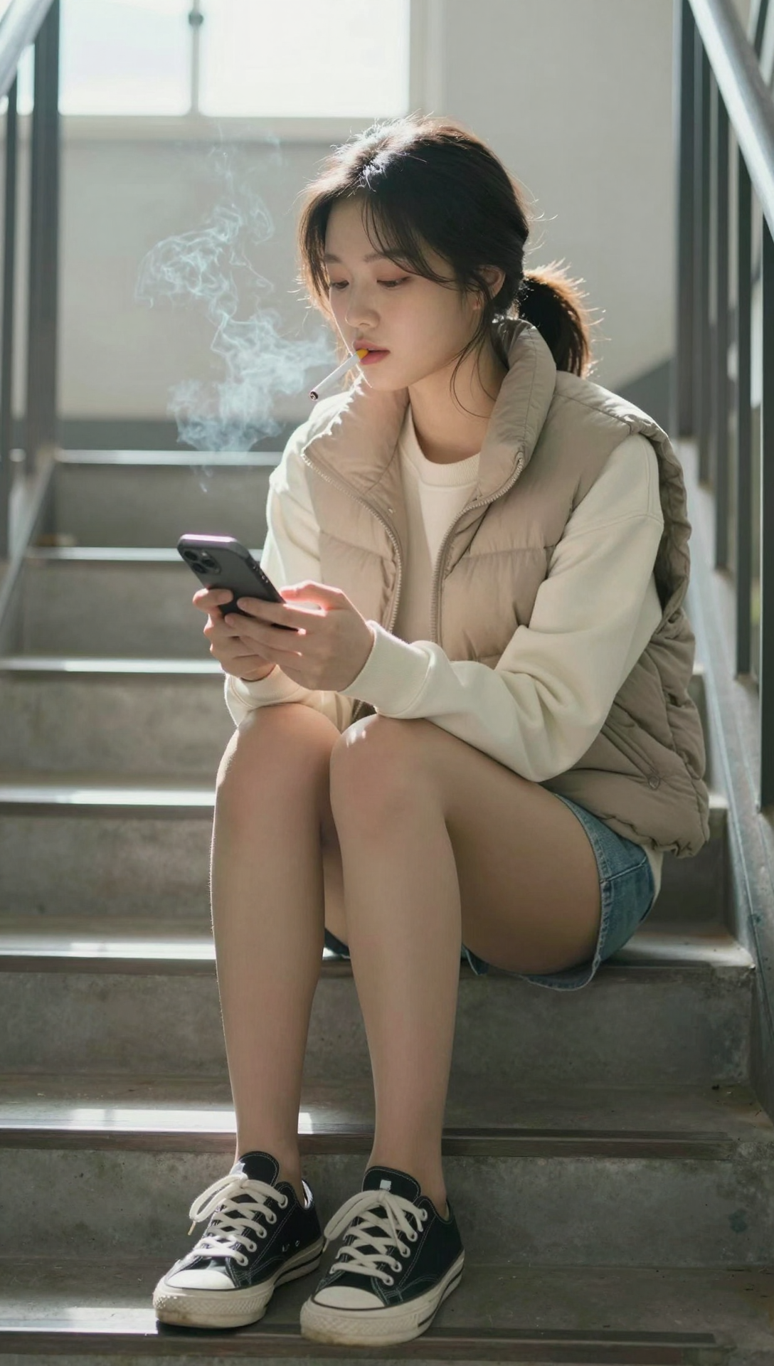 Beautiful cute Korean young woman sitting alone on a gray concrete stairway inside a quiet building, soft natural daylight entering from a high window behind her, gentle backlight outlining her hair and shoulders, calm yet slightly tired expression with half-lidded eyes, lips softly parted while exhaling faint vapor from a slim electronic cigarette, gaze lowered toward her smartphone held loosely in one hand, dark hair tied in a low ponytail with soft strands framing her face, wearing a beige padded vest over a cream sweatshirt, short denim shorts, sheer beige stockings, and black-and-white low-top sneakers, knees drawn together in a modest relaxed posture, metal stair railings on both sides, minimal industrial background with subtle Korean signage blurred behind, cinematic shallow depth of field, soft neutral color grading, realistic skin and fabric texture, quiet urban solitude atmosphere, modern lifestyle photography style, gentle emotional stillness, balanced vertical composition, ultra-high resolution, 4k masterpiece, premium visual quality
