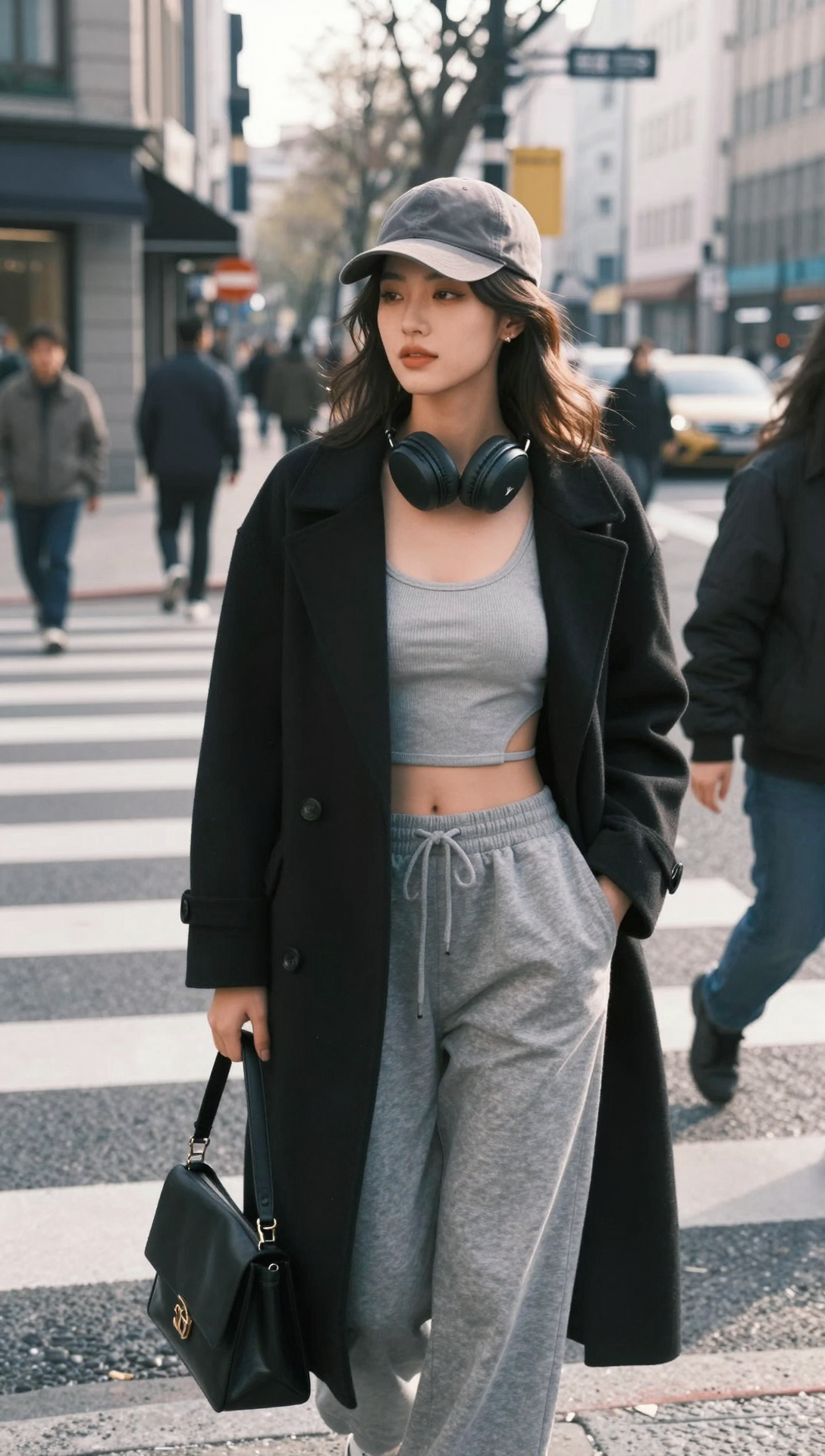 An eropean woman stands on a city crosswalk, dressed in a fashionable casual outfit. She wears a gray baseball cap, a black oversized coat over a form - fitting light gray ribbed crop top with side cutouts, and gray drawstring sweatpants. Large black headphones hang around her neck, and a stylish black handbag with a circular logo rests against her hip. Pedestrians can also be seen in the distance, creating a vibrant urban atmosphere. The crosswalk’s striped pavement and the building’s architecture enhance the modern, cosmopolitan feel of the scene.