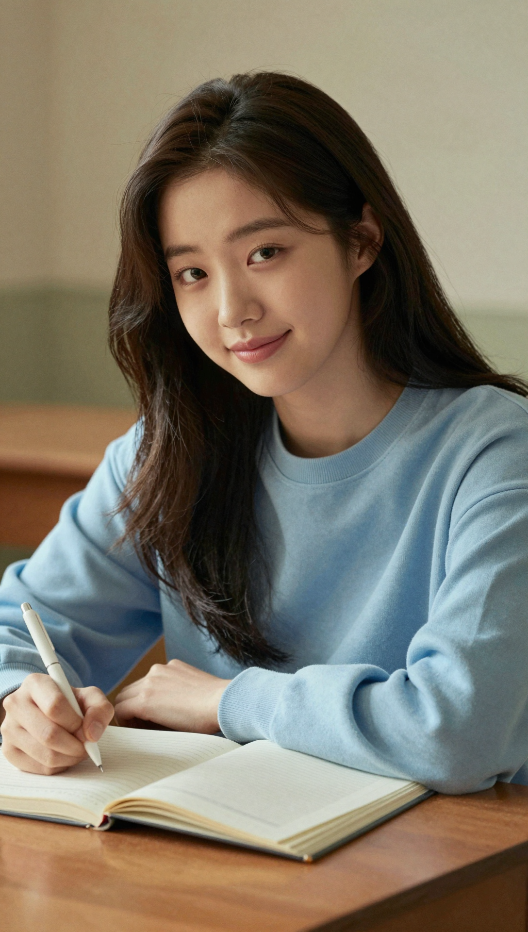 Ultra-detailed portrait of a beautiful young Korean woman sitting at a wooden desk writing in an open notebook with a white pen, medium close-up front angle, soft natural indoor lighting, warm beige background, long dark brown hair falling over one shoulder, light blue sweatshirt, calm posture, eyes gently focused toward the camera, subtle eye softness, lips forming a very slight gentle likable smile, expression blending quiet warmth and calm confidence, smooth clear skin, soft pastel color grading, cinematic depth of field, elegant modern photography style, emotional but restrained atmosphere, ultra realistic 4k masterpiece quality