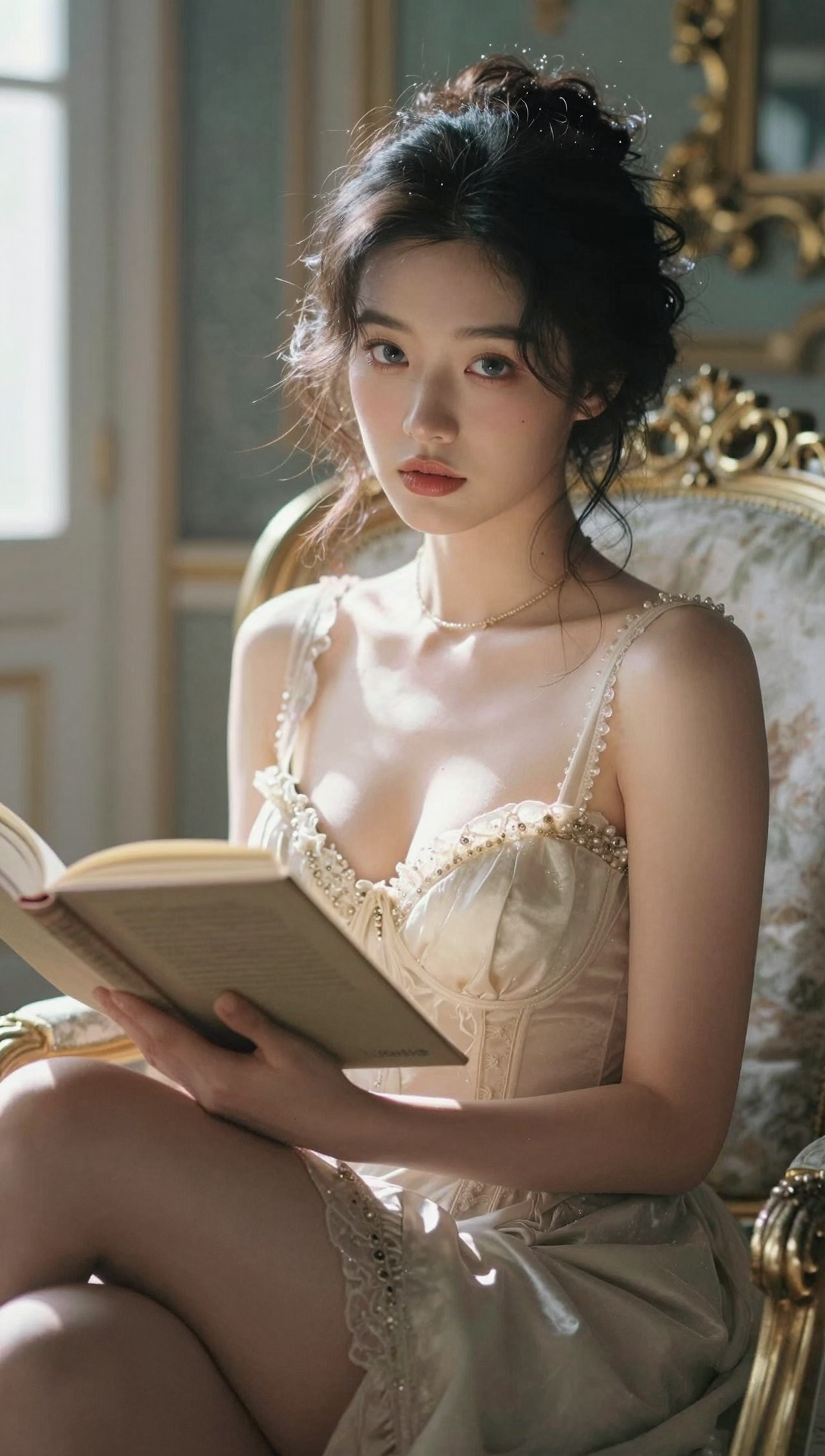 intricate details, masterpiece, best quality ethereal fantasy concept art of one beautiful French countess, textured skin, cleavage, big breasts, puffy lipstick, necklace, high pouf hair and gray eyes, sitting reading a book, looking at viewer, fashion photography, rococo, palace sitting room , dramatic lighting magnificent, celestial, ethereal, painterly, epic, majestic, magical, fantasy, dreamy