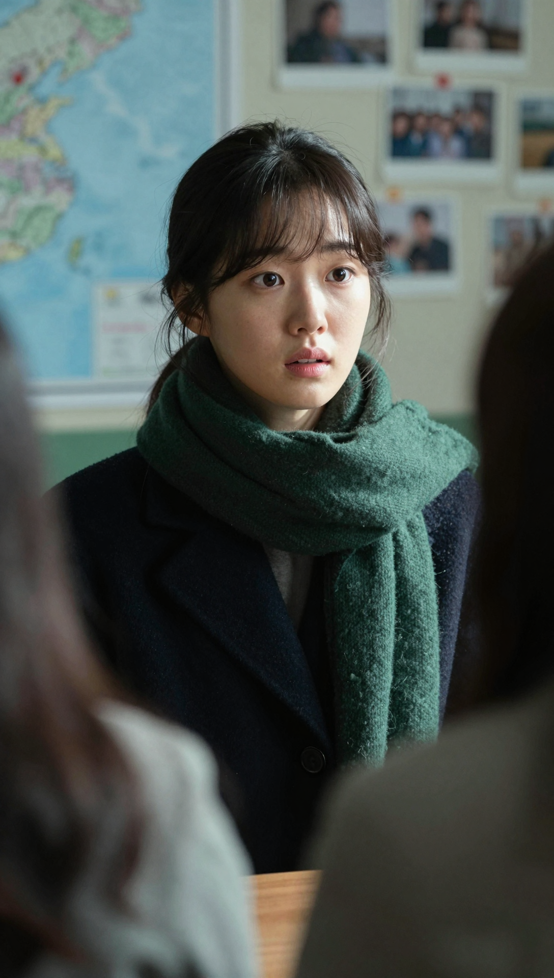 A beautiful Korean young woman in a tense indoor investigation room, front-facing close-up with slight three-quarter angle, eyes wide with quiet shock and focused attention, lips slightly parted, soft natural bangs framing her forehead, dark hair loosely tied back, wearing a thick dark green wool scarf and a simple dark coat, calm but anxious emotional expression, cool cinematic lighting with soft shadows, blurred foreground silhouette of another person, background wall covered with pinned maps, photos and notes in blue and neutral tones, shallow depth of field, subtle film grain texture, realistic dramatic movie still atmosphere, smooth natural skin texture, minimal makeup, muted color palette, high realism cinematic photography style, ultra high resolution 4k masterpiece quality